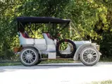 Although now an older restoration, the car presents well. The light grey body contrasts nicely with deep red buttoned leather upholstery, highlighted by brass lamps and radiator shell. The black canvas top is in very nice condition, and a wicker hamper is strapped to the rear. The undercarriage is clean and painted body color; the engine compartment is tidy and correctly detailed. There is no instrumentation, save for a dashboard-mounted key-wind clock. The brake and clutch pedals are cast brass and labeled, and the car carries its original serial number plate, Selden Patent plate, and a Century Old Vehicle plaque from the Horseless Carriage Club of America.