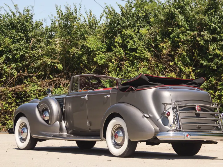 The gorgeous car offered here is finished in lovely metallic silver with a contrasting red leather interior with black carpets accented by red binding. Paintwork is described as being in overall excellent condition, while the interior wood on the door caps, windshield surround, and divider window trim is excellent. The black canvas roof is piped in red, which contrasts beautifully with the silver exterior. The Packard has been comprehensively restored to a high standard and continues to be in excellent mechanical and drivable condition while at the same time being perfectly suited for the show field. Packard’s V-12 line continued to use floor shifters as standard equipment despite the fact that the remainder of the Packard line had column shifts. This car, however, is fitted with the $240 optional column shift, making it even rarer in the already rarified world of V-12 Packards.