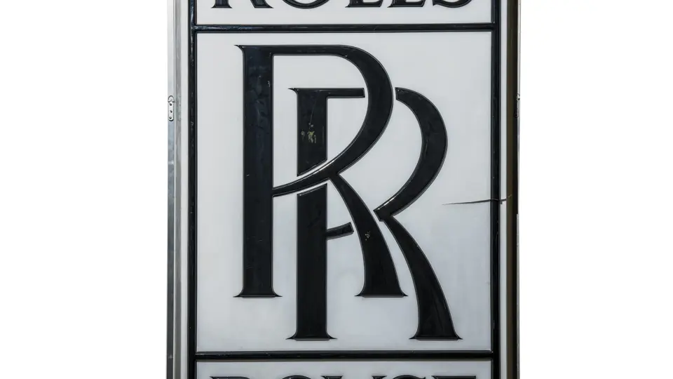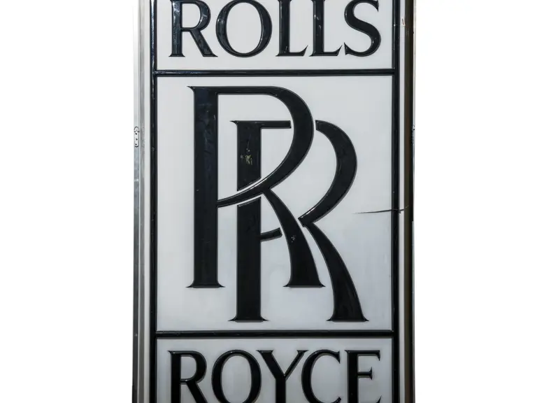 The classic Rolls-Royce crest illuminates this striking dealership sign. The surface shows minor wear with a crack in the upper corner, but otherwise, it is in presentable condition and good working order.