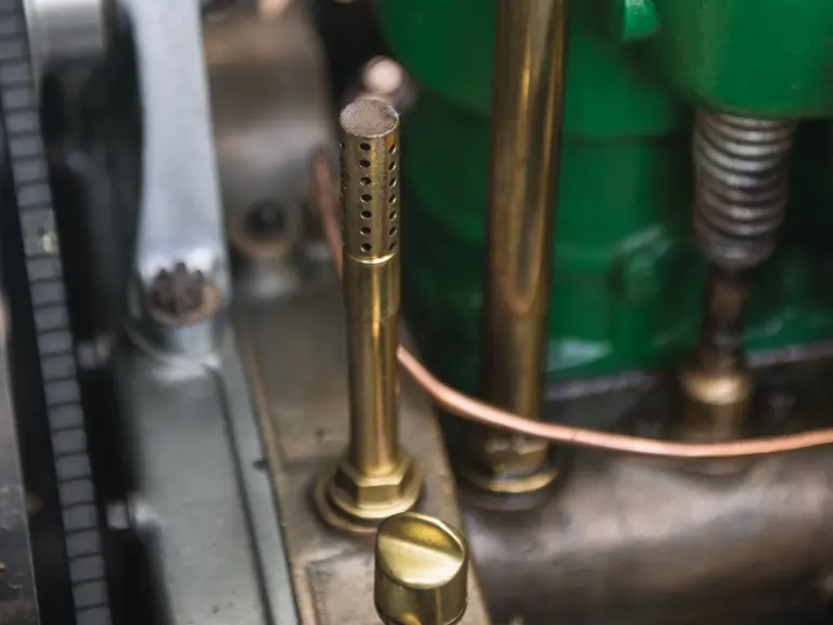 This highly sporting Locomobile has been known in the hobby for some 60 years. Ownership history includes Ralph B. Loucks Jr., a well-known early enthusiast and sportsman from Chicago, and the great collector Charles LeMaitre. It bears a Second Prize brass plaque on the dashboard, from the 50th anniversary celebration of that famous 1908 Vanderbilt race, which was held on 25 October 1958, at Old Westbury, Long Island. Photos taken around that time show it in its current configuration, with a monocle windshield, brass lighting, a center-mounted Rushmore spotlight, gas headlights, and kerosene side-lamps.