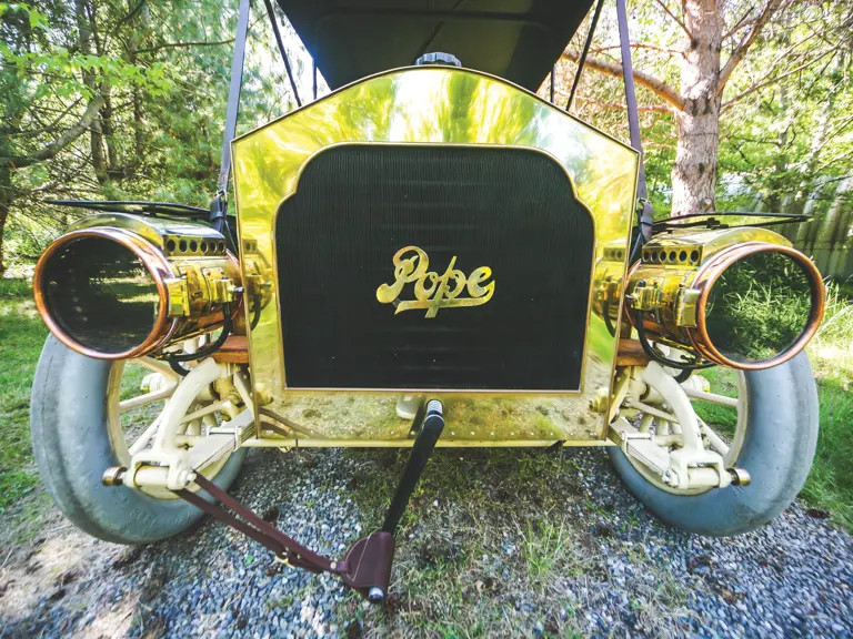 The current owner acquired this exquisite Pope-Hartford Model D from the estate of Herb Prentiss in 2005. A former president of the Horseless Carriage Club of America, Prentiss had owned it some 30 years and performed a most careful restoration. Its features include a battery ignition with Splitdorf coils, a gear-driven water pump, and an oversized radiator. The total-loss lubrication is managed by a brass McCord oiler. A French Testophone four-trumpet brass bulb horn provides ample warning, to pedestrians and other motorists. A 12-volt electric starter has been added for turn-key convenience, and it has recently been fitted with new tires.