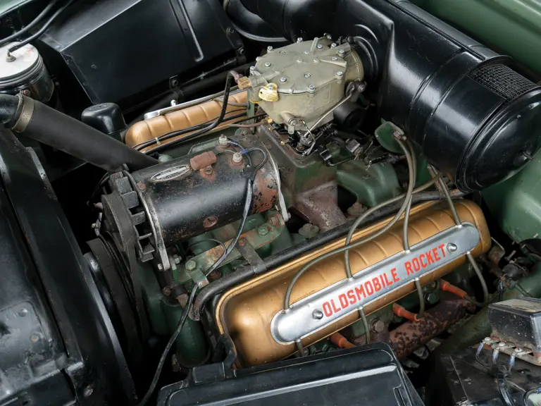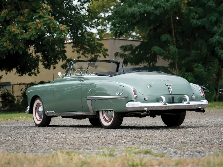 The Deluxe convertible coupe offered here, one of 5,434, is a highly original example, finished in its factory color of Seafoam Green with a two-tone green interior and black power top. It is equipped with Hydra-matic transmission, AM radio, heater, locking gasp cap, and dual fog lights, and has recorded only 29,800 actual miles, which the consignor believes to be the original miles from new. It is offered with a set of service manuals and with the original bumper jack and spare.