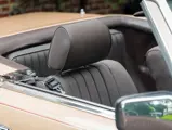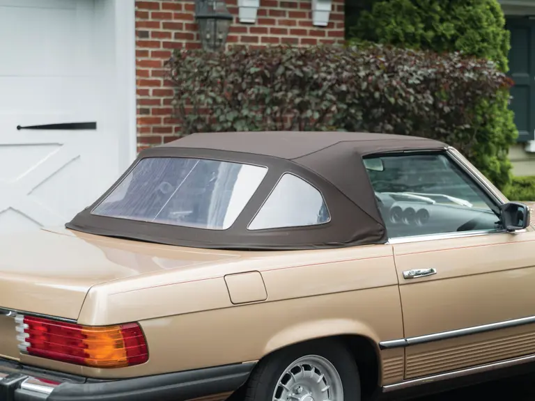 Launching first in the U.S. as the 350 SL, the roadster’s name was upgraded to 450 SL a year later to reflect its 4.5-liter V-8 engine. A vacuum-controlled three-speed automatic transmission provided smooth, unhurried shifts. A majority of R107s were delivered new to the U.S. market, including the example offered here. Painted in a classic Champagne Metallic over brown leather with a brown fabric top, this SL rides on correct “Bundt” alloy wheels. Its U.S.-market bumpers are straight and untarnished. Fog lamps, a popular period upgrade, hang from its front bumper.
