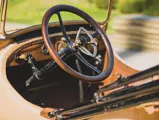 A tidy older restoration, this 1917 Abbott bears the older Abbott-Detroit nameplate. It is tan with pleated brown leather upholstery; the undersurface of the fenders matches the deep red hue of the chassis. The engine is Continental’s 7W, a 224-cubic-inch L-head six making 36 bhp at 1,600 rpm. It is clean and utilitarian, without excessive cosmetic detail. Other equipment includes Flintex headlamps and a MotoMeter on the radiator cap. A capacious piece of leather luggage nestles between the fuel tank and rear-mounted spare tire, useful for those who travel on weekends.