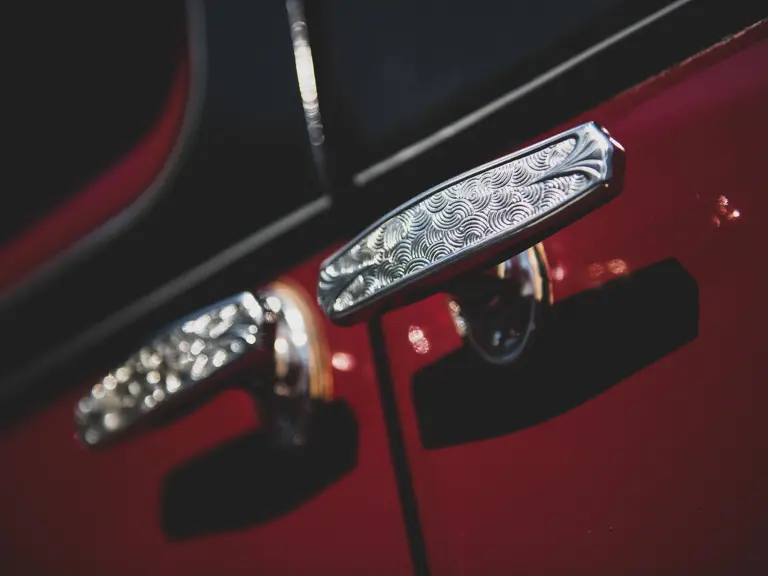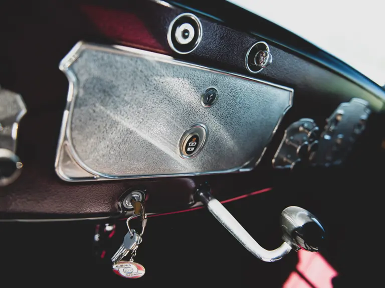 Acquired by the Merrick Auto Museum in 2004, it has a long succession of Auburn Cord Duesenberg certifications through at least five owners and several restorations. The original owners are said to be Frank and Pearl Mesta from 1930. Subsequently it has passed through the hands of a party named Danner, Bill McDuff (twice), and Odell Friar. Originally Emerald Green, after a comprehensive body-off restoration it is now painted in maroon with black fender accents and white pinstriping. The interior is upholstered in beautiful grey-and-burgundy wide-pleated buttoned mohair velvet broadcloth. Chromed wire wheels hold six Lester 7.00-18 wide whitewall tires; the dual side-mount spares have keyed locks.