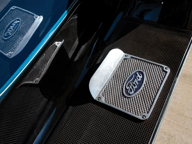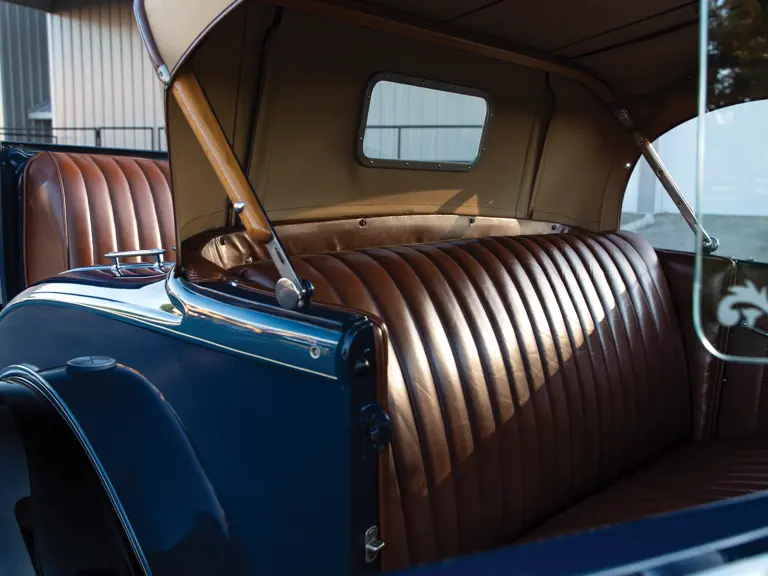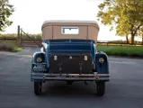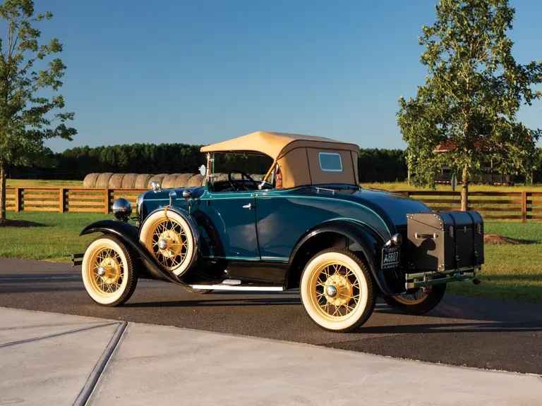 Finished in the most desirable color combination of Washington Blue with straw wheels and pinstripes, this jaunty Model A is well equipped with wind wings, quail radiator mascot, accessory trunk, whitewall tires, and dual side-mount spares with chrome tire bands. Formerly part of the Clyde Ensor collection, it has been driven and enjoyed by the consigner and stored in a climate-controlled environment while in his possession.