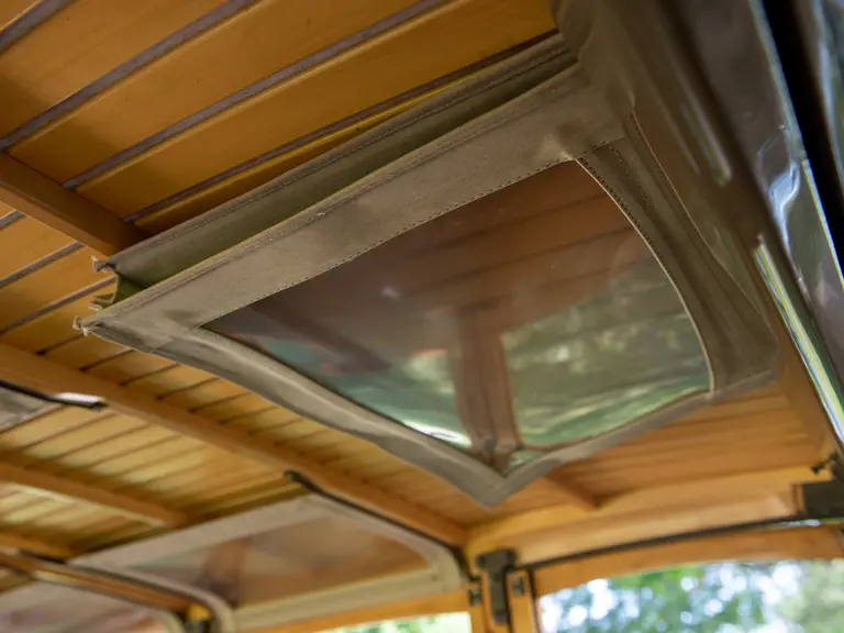 This excellent example of Ford’s early station wagon that has been in a private collection for more than 35 years. It has been stored in a climate-controlled facility since restoration and is the recipient of numerous AACA and Early Ford V-8 Club awards. A Columbia rear-end has been installed to enhance drivability. It is claimed to have its original wood and is nicely fitted with retractable side curtains; it also has an accessory oil check gauge and a dual fuel/temperature dashboard gauge. Properly finished in tan with black fenders specified by the factory on early station wagons, it was signed by The Beach Boys in 2007 on the side of the glovebox door.