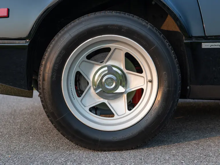 As presented today, this 512 BBi retains many of its factory-correct finishes throughout, including its Nero paintwork, tan Daytona-pattern upholstery, Pioneer audio system with equalizer, Cibie foglamps, and Vitaloni mirrors. The car’s correct center-mount wheels and Michelin TRX tires are yet another authentic complement to its low stated mileage. Interestingly, at some point under previous ownership, the exhaust manifolds of the car’s numbers-matching V-12 were coated with bright red enamel—an aesthetically pleasing, if not factory-correct, choice.