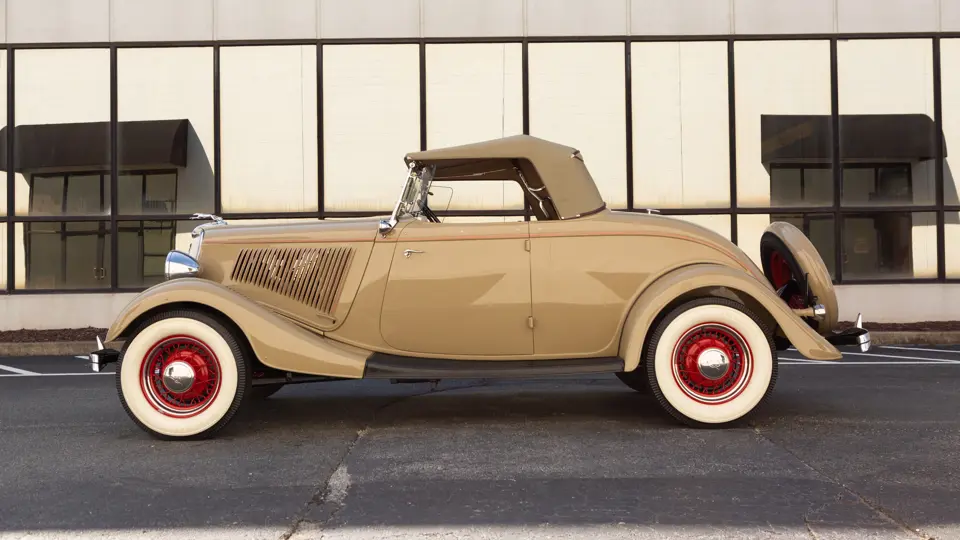 This very fine 1934 Ford DeLuxe Roadster is a former AACA award-winner that still presents in outstanding order today. It is handsomely finished in a subtle beige color, complementary red wheels, and a tan cloth convertible top. It is well-equipped with a rumble seat, chrome grille and bumpers, dual horns and tail lamps, cowl lamps, and a rear-mounted spare—all typical equipment for the DeLuxe trim level. The 221-cubic-inch Flathead V8 is properly detailed with correct Ford Green engine paint, as well as properly finished ancillaries, fittings, and wiring. The undercarriage is clean and tidy, also reflective of the high-quality nature of this restoration, and in keeping with the care and maintenance it has been treated to since.