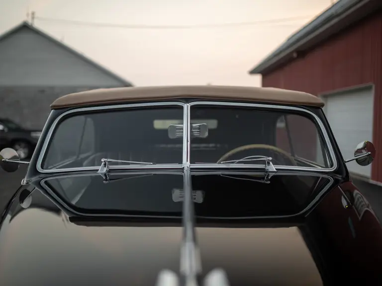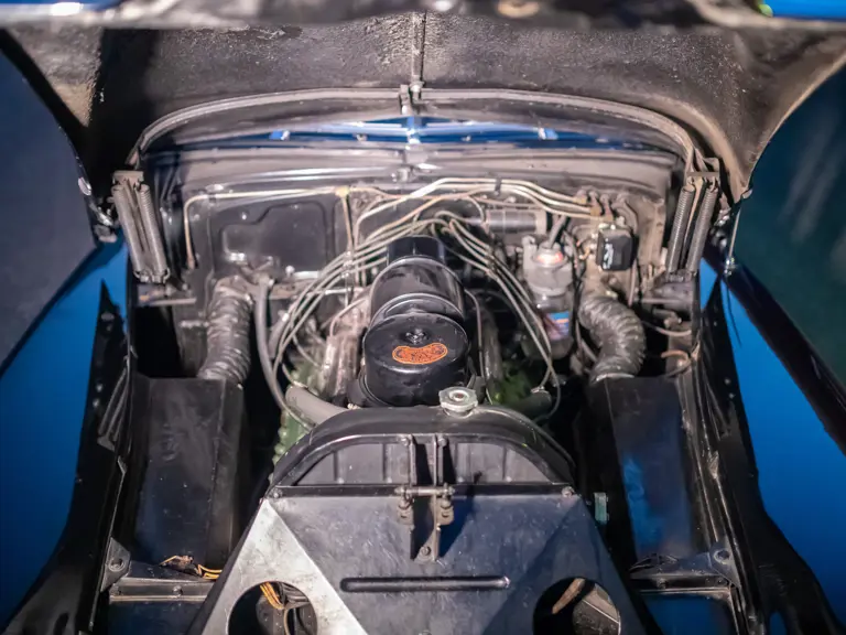 As presented today, this Series 62 Convertible still wears its original color combination of a black exterior over tan bedford cord and red leather upholstery beneath a tan convertible top. All the features listed on its built sheet have been faithfully maintained over the past 75 years of enthusiast ownership, and observation of the car’s 346 cubic-inch V-8 engine reveals it as the numbers-matching unit to the chassis number. This remarkably presented and rare Series 62 Convertible Coupe is now accompanied by a spare wheel, original owner’s identification card, and a copy of its factory build sheet.