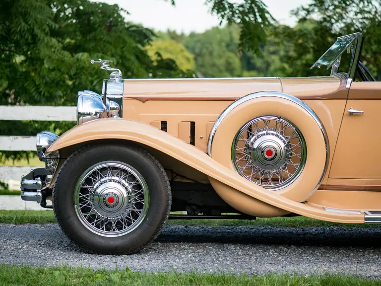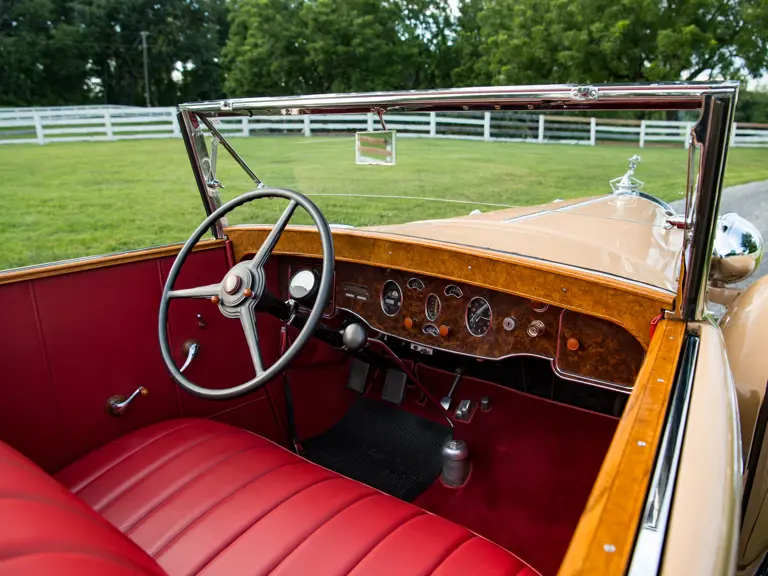 In addition to the low-profile top distinctive of the model, another feature of this car believed to be unique is a full trunk rather than a rumble seat, which, along with the proper, fitted trunk rack, makes the car a superb, capacious, long-distance tourer. The earth tones of the body, a combination of creamy tan with russet brown moldings, flatter the subtle beauty of the car’s lines. Dual side-mounted spares with chromed covers and mirrors, dual Pilot Ray lights that turn with the front wheels, a chrome radiator stone guard, and the Packard Goddess of Speed radiator mascot complete the stunning package.