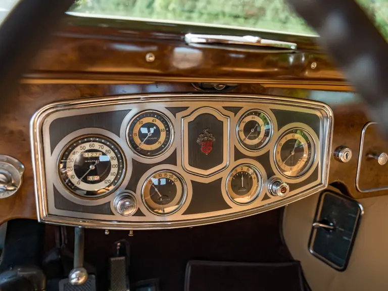 The most desirable body style on this chassis is the sumptuous two-passenger coupe roadster, which had styling inspired by a “semi-custom” design provided by LeBaron in 1931, including the distinctive convertible top that folds flush with the body.