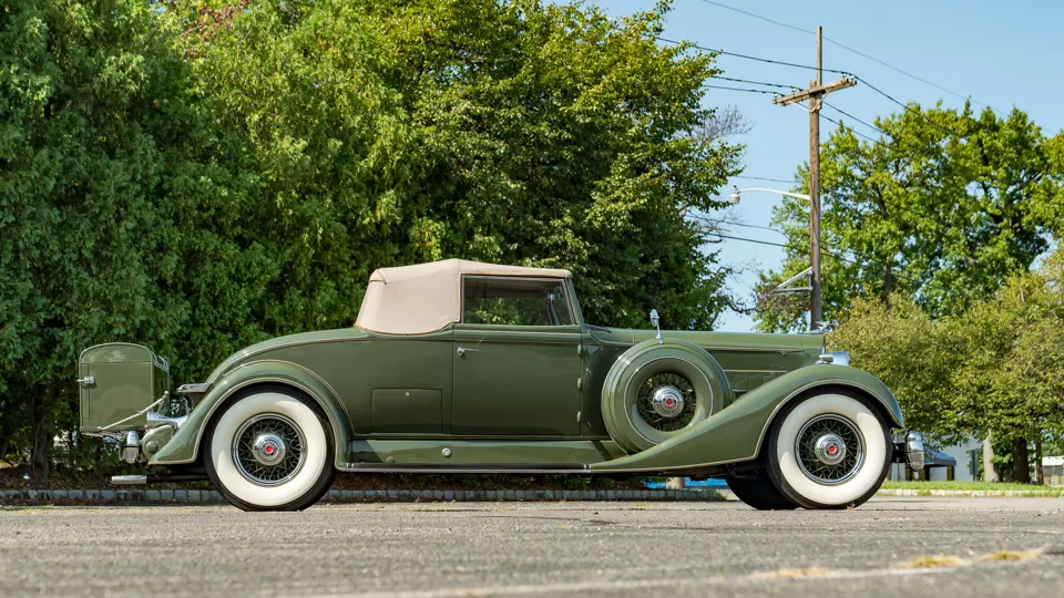 The Super Eight coupe roadster offered here is one of approximately 20 examples known to survive. It retains its original vehicle number tag denoting it as the 129th produced this year and that it was delivered new in Peconic, Long Island, on 14 April 1934. It wears a well-preserved older restoration in Chicory Green, striped in straw yellow with a tan leather interior and cloth top. Accessories include the larger, counterweighted Packard Twelve-style bumpers, as well as a painted radiator shell, both of which were standard on the Twelve but optional on the Super Eight. It is additionally equipped with dual driving lights, dual side-mounted spares with metal covers and mirrors, and a rear luggage rack with full metal trunk. Under former ownership, the car was shown at the Greenwich Concours d’Elegance in 2010.