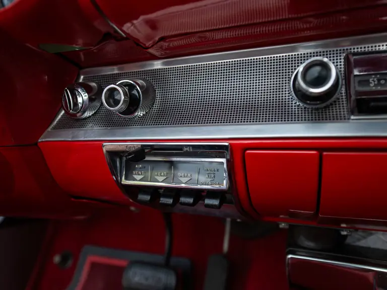 Assembled in St. Louis, Missouri, this true VC-coded Chevrolet Bel Air Convertible proudly displays the crossed checkered flag fender emblem denoting its 283 cubic-inch “Fuelie” engine. The car’s trim tag indicates it came finished from the factory in Imperial Ivory over a red and silver two-tone vinyl interior. Said to have been the recipient of an older restoration, this Bel Air’s exterior is now finished in stunning Imperial Ivory over Matador Red for a handsome, period look that perfectly complements the eye-catching interior. A correct Chevrolet AM radio, square dash clock, gold Bel Air emblem, and unusual chrome tissue dispenser round out the Matador Red dash, while 14-inch steel wheels wear chrome Bel Air “spinner” hubcaps and are shod in wide whitewall tires. Copies of several invoices documenting the consignor’s fastidious maintenance are available for review.
