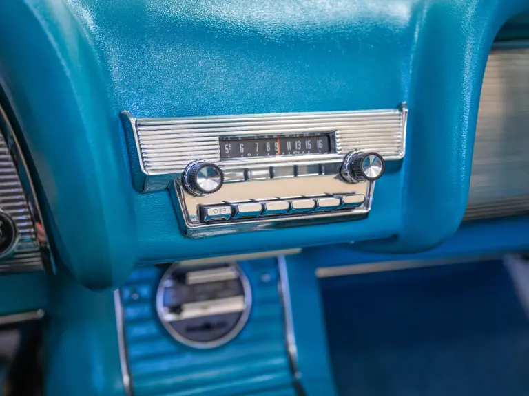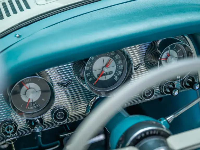 The Ford Design Studio, led by Bill Boyer, began working on a four-seater Thunderbird in mid-1955. What eventually became the “Squarebird,” as enthusiasts call it, featured a wheelbase five inches shorter and a height four inches lower than the contemporary full-sized Ford, but lost only a quarter-inch of ground clearance and rear seat headroom, as engineers sat the passengers low between the high door sills and a large drivetrain tunnel. Cleverly, Boyer hid the tunnel within an aircraft-style console, which was a fresh idea in 1958 and welcomed by the jet-wild public—and also pioneered the “bucket seat-and-console” interior trim that would be a benchmark of the “personal luxury” concept.