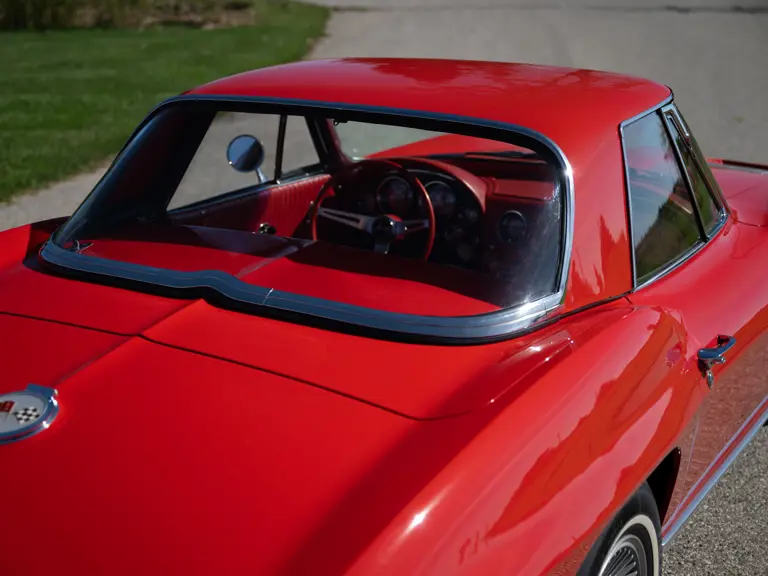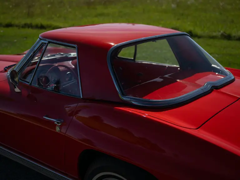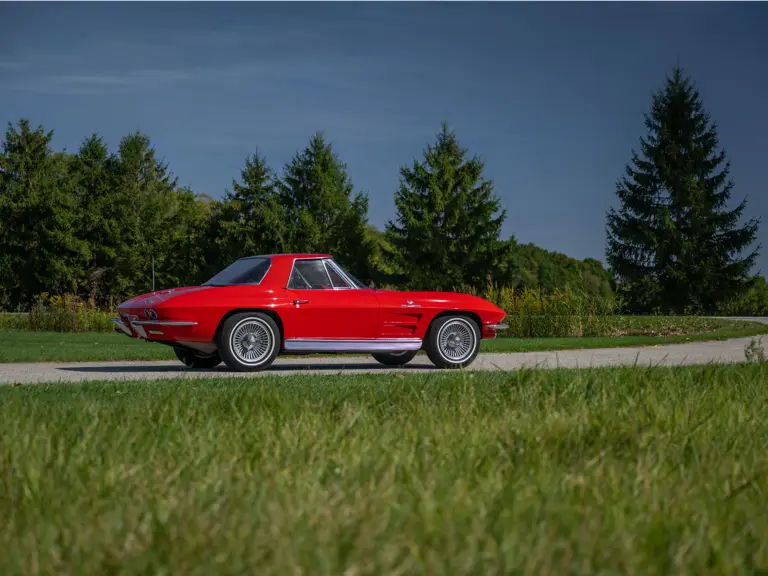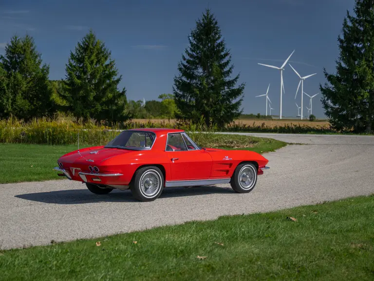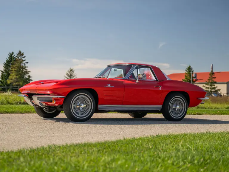 Offered today from more than 35 years within the prized ownership of the consignor’s family, this fuel-injected 1963 Corvette Sting Ray Convertible was delivered new to Tom Harris Chevrolet of Zionsville, Indiana. Originally finished as it is today in Riverside Red over red vinyl, this first-year Fuelie convertible benefits from a highly detailed and well-preserved restoration reportedly completed in 1984, just prior to entering the current family’s ownership. A correct and numbers-matching L84 engine is present with date-correct head (number 3782461), Rochester fuel-injection unit (number 7017375), and intake assembly (number 3826810). About halfway through the 1963 model year, Chevrolet switched the L84 transmission pairing from the Borg-Warner T10D to the Muncie M20 wide-ratio gearbox. As an early car, this impressive example retains its proper, numbers-matching T10D unit. Additional features of note include the correct-for-1963 signal-seeking radio, a matching Riverside Red auxiliary hardtop, polished injection cover, and 15-inch Turbine wheels.