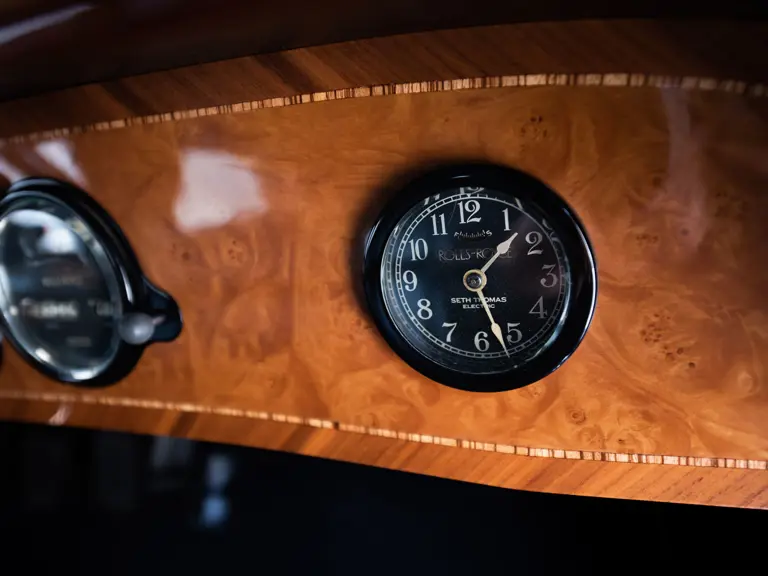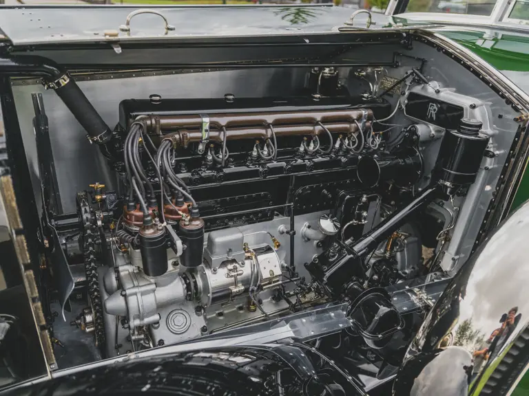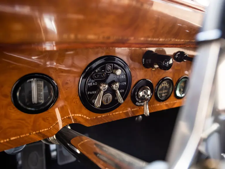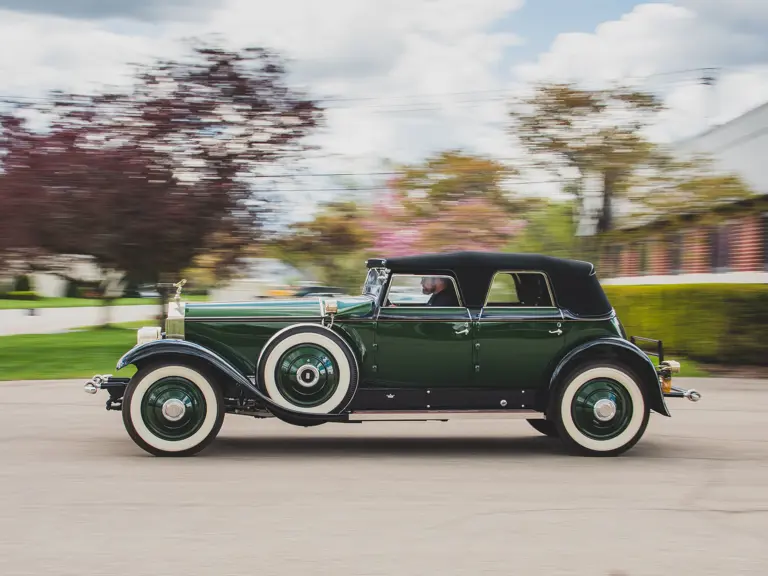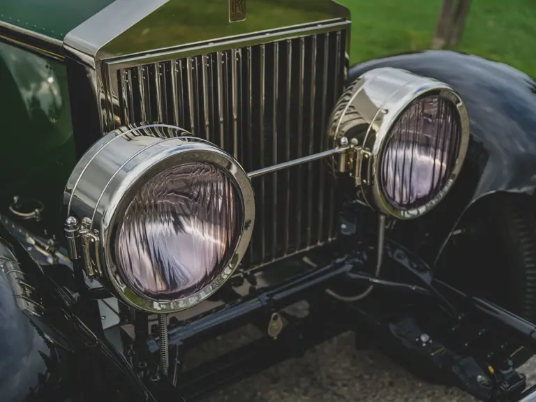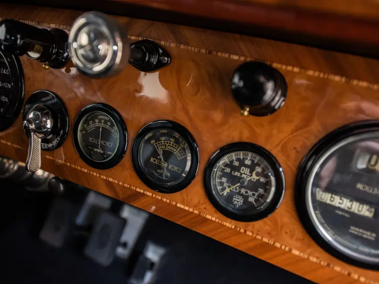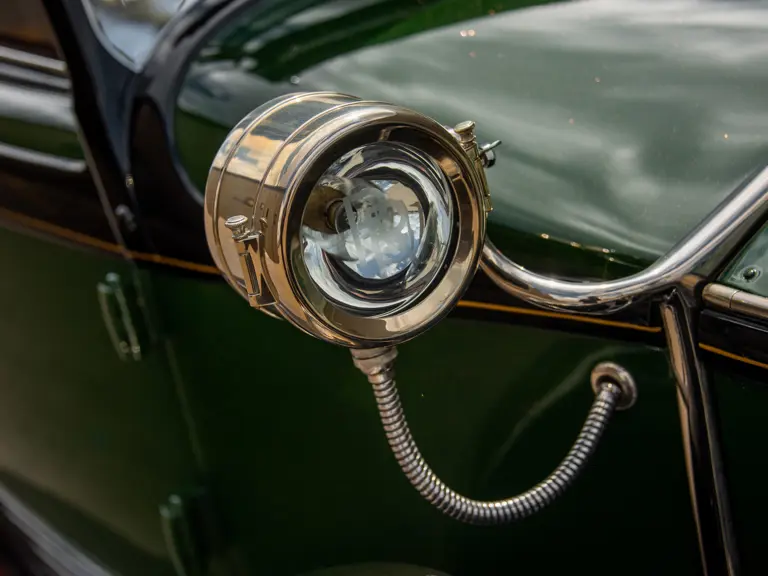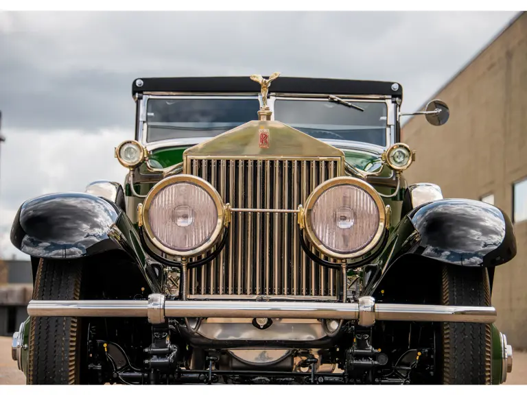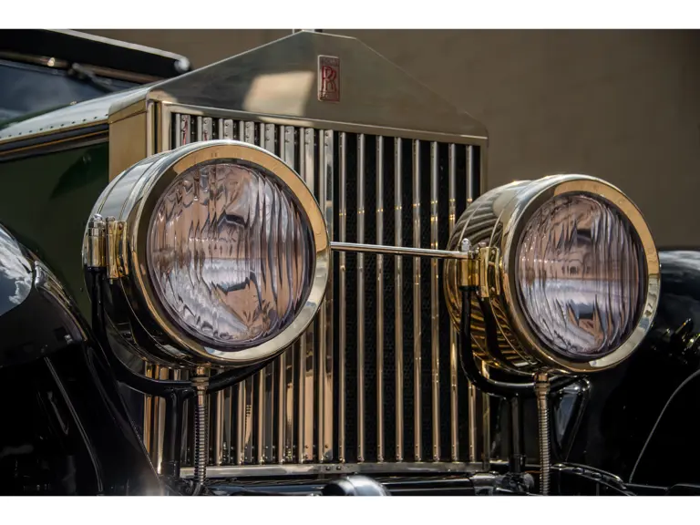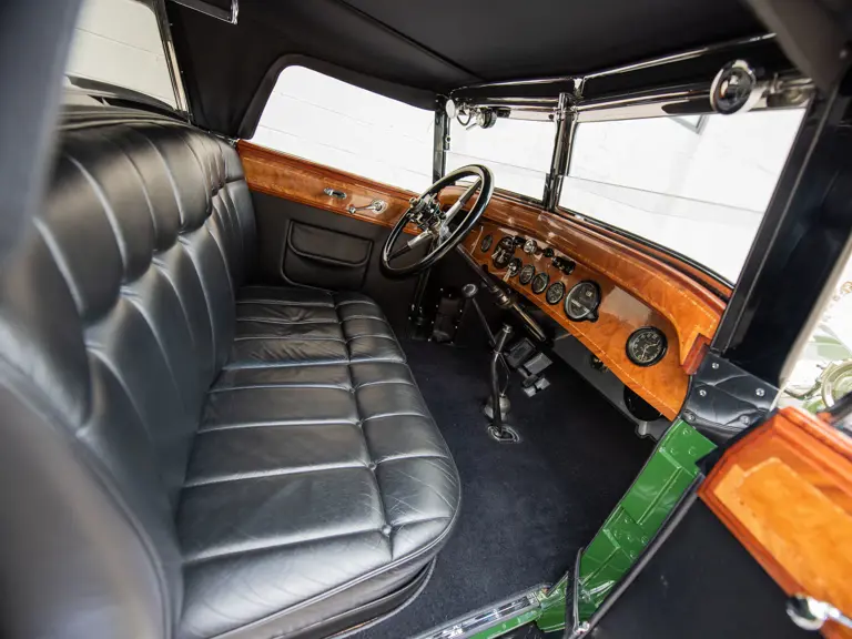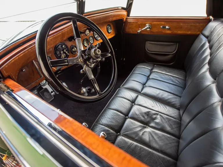 Noted collector John O’Quinn acquired the Phantom I from Mr. Morrison in 2007 and submitted it to marque expert Rick Hamlin of Wellington, Kansas, to receive an exacting, multi-year restoration to original specifications. Hamlin’s team entirely disassembled the original coachwork, revealing fascinating details of Hibbard & Darrin’s patented Sylentlyte cast-Alpax construction method, as well as remnants of the original, subtly iridescent medium green finish, which was fastidiously recreated. Similarly, the interior was fully restored to its original appearance, complete with the correct fine hardware and book-matched wood inlays for which the coachbuilder was justly renowned.