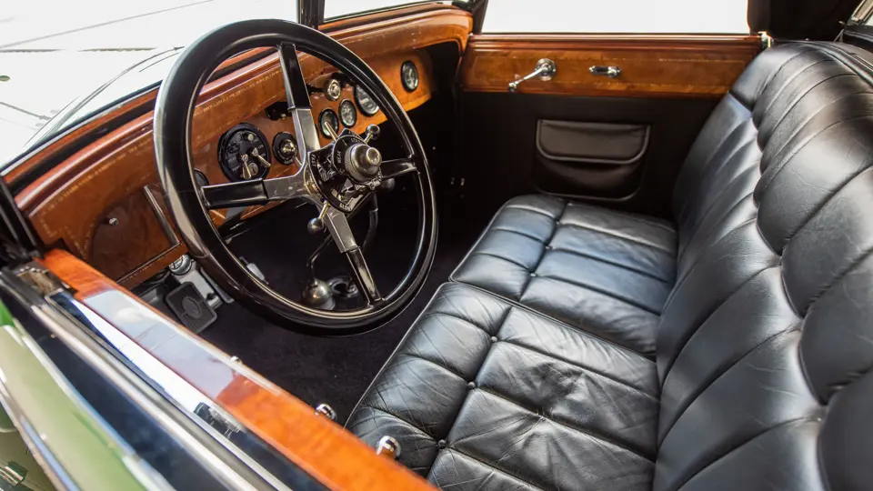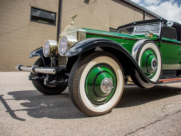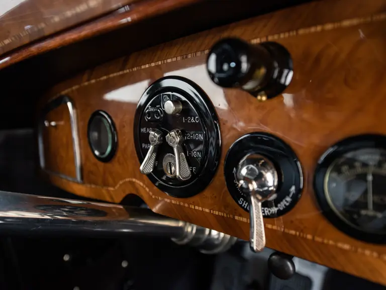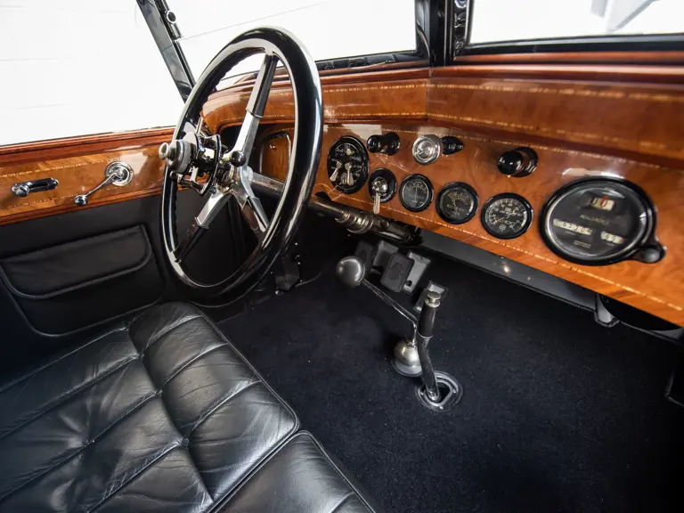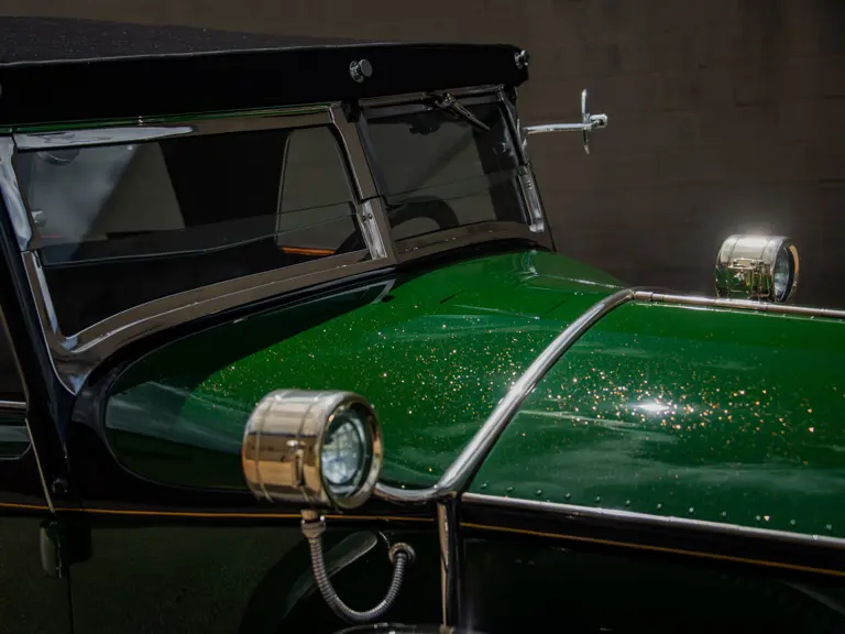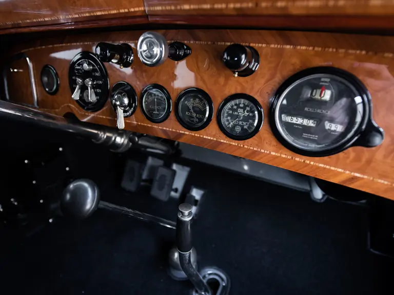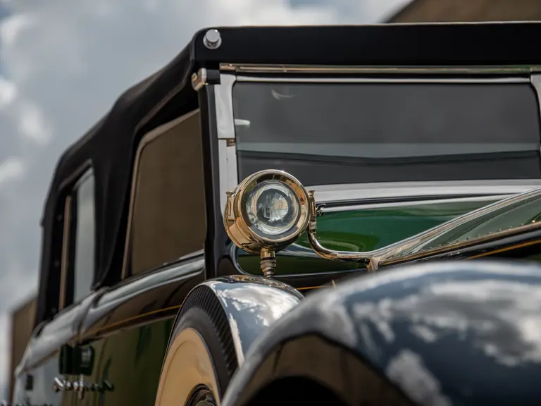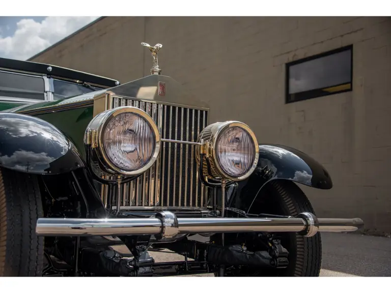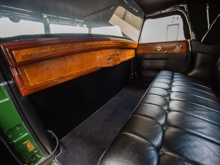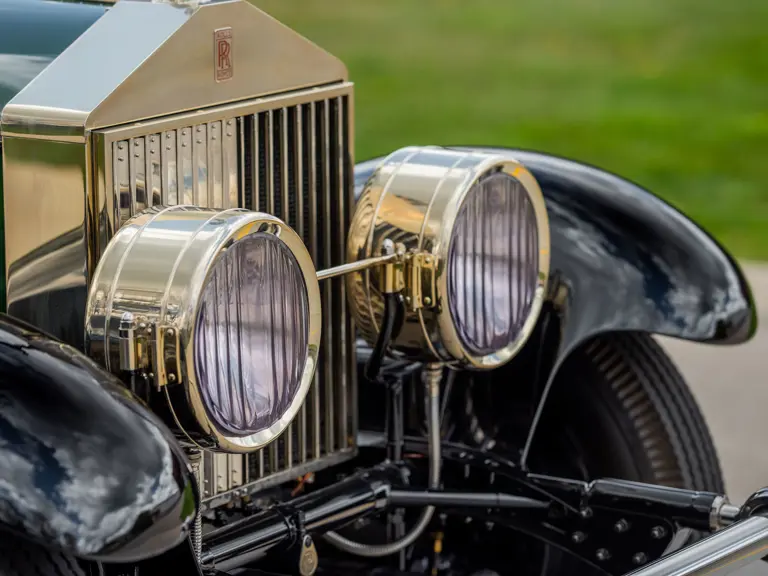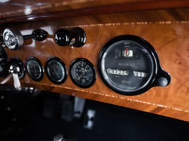 Noted collector John O’Quinn acquired the Phantom I from Mr. Morrison in 2007 and submitted it to marque expert Rick Hamlin of Wellington, Kansas, to receive an exacting, multi-year restoration to original specifications. Hamlin’s team entirely disassembled the original coachwork, revealing fascinating details of Hibbard & Darrin’s patented Sylentlyte cast-Alpax construction method, as well as remnants of the original, subtly iridescent medium green finish, which was fastidiously recreated. Similarly, the interior was fully restored to its original appearance, complete with the correct fine hardware and book-matched wood inlays for which the coachbuilder was justly renowned.