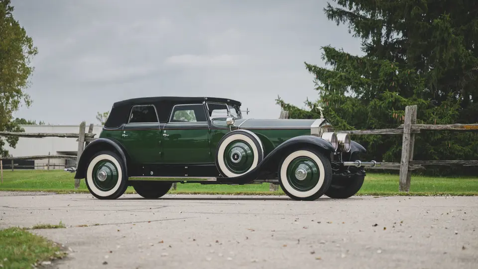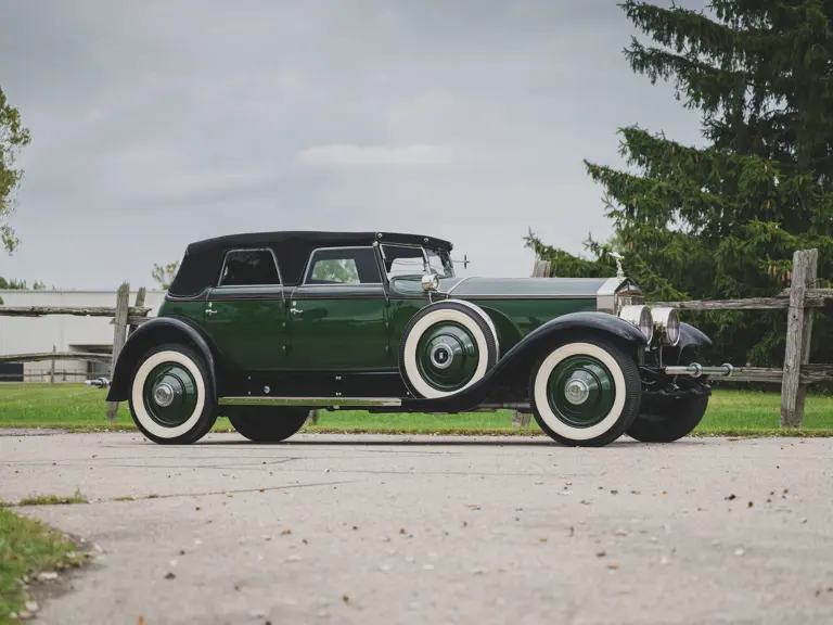 The first was a bouquet. The second was this Rolls-Royce Phantom I, one of only five Springfield-built Phantom I models with this fascinating, versatile “Transformal” Phaeton body by Parisian coachbuilders Hibbard & Darrin. It bore all the finest hallmarks of its creators: a prominent, heavy beltline molding, delicate, scrolled door handles, and the patented second windshield and tightly nested trapezoidal side windows. A two-piece windshield design and a unique rearview mirror set it apart from its brethren in their small series.