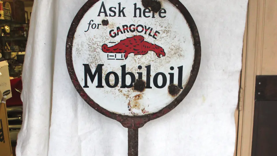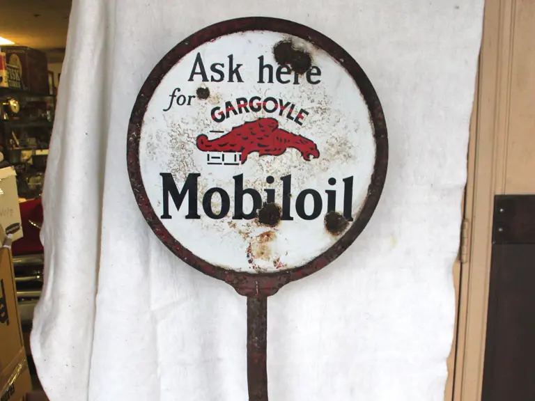 A Mobiloil Gargoyle 'lollipop' curb sign, original double-sided porcelain enamel curb sign with original post and cast iron base. Ware from age and outside elements.