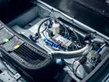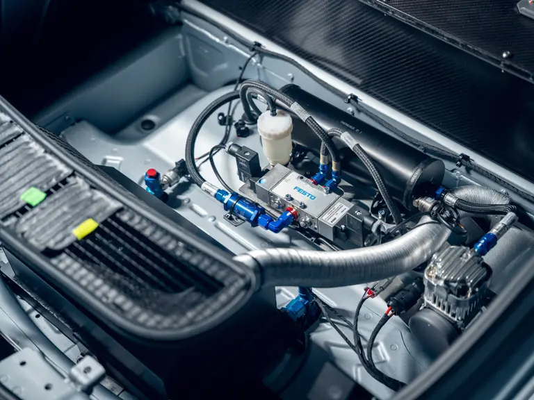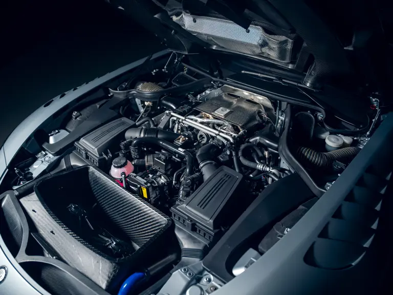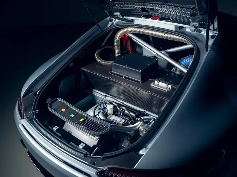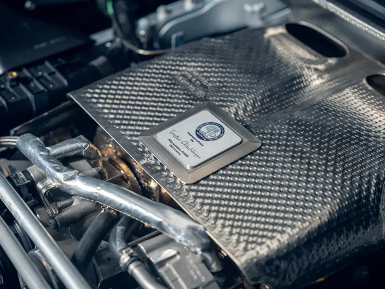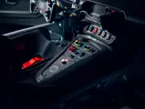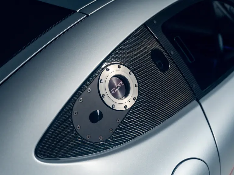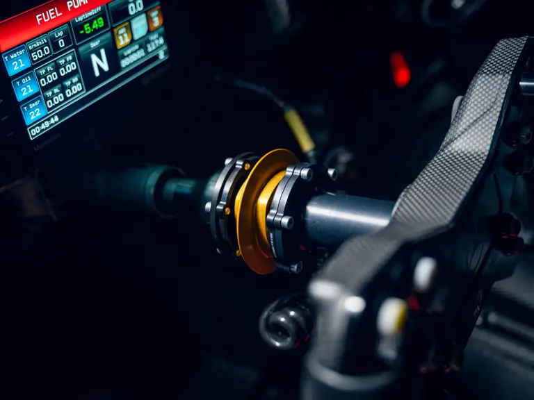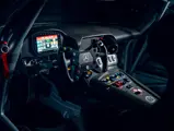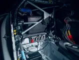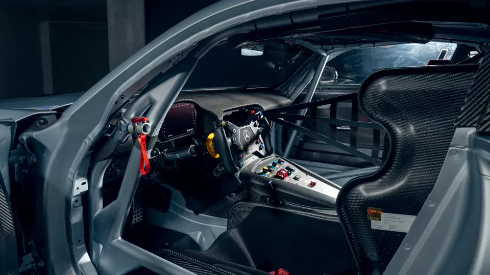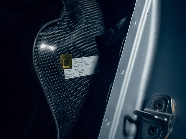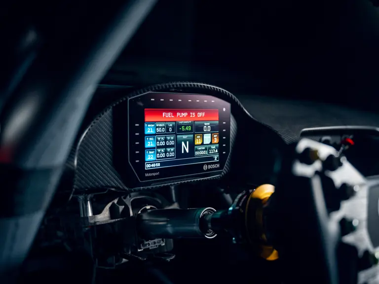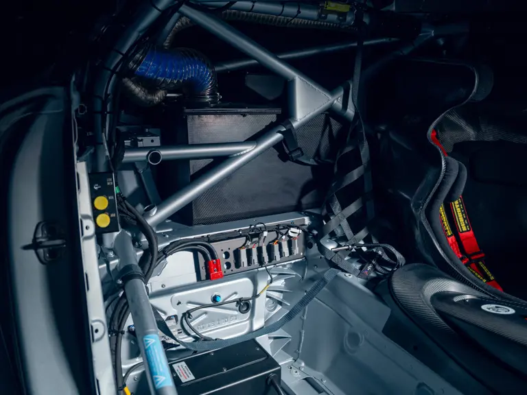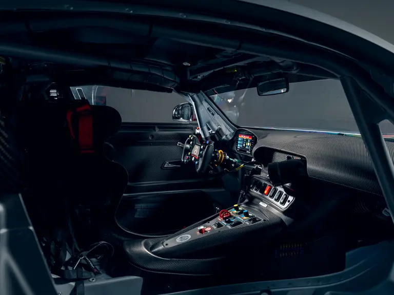 The interior is stripped of all non-essentials, purpose-built for competition. A full FIA-compliant roll cage spans the cabin, enclosing carbon fibre racing seats with Schroth harnesses, a steering yoke inspired by GT3 and GT4 machinery, and a focused array of racing controls. Nearly every interior panel is finished in exposed carbon fibre, underscoring the car’s commitment to lightweight, functional design.