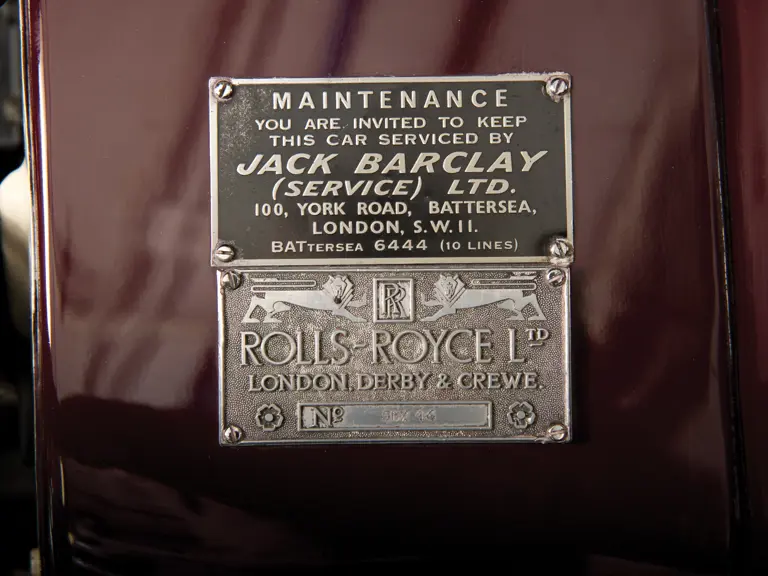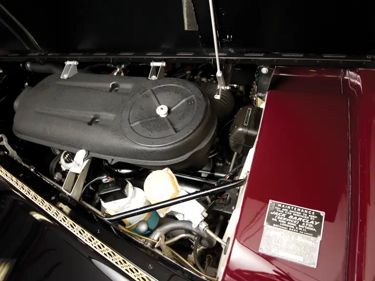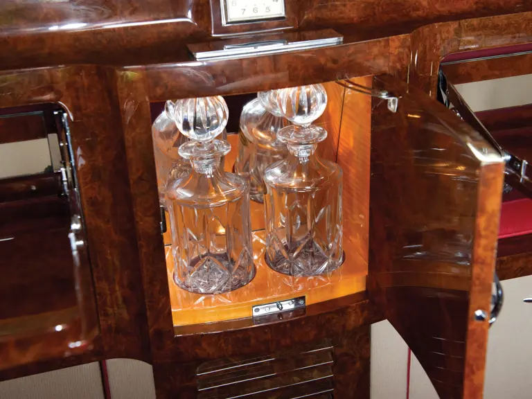 The car is in near-perfect condition, finished in burgundy over black lacquer, with burgundy hides to the front and beige cloth with burgundy hides and burgundy piping to the rear. It is complete with all glassware in its elaborate bar, hand and road tools and handbook.