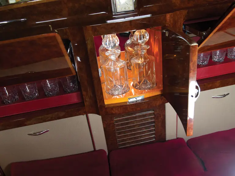 The James Young bodies, with their special features like Razor-edge fender crowns, square push-button door handles and “bustle-trunk” rear styling, were the most popular and recognisable of all the Phantom V designs. And the interiors were so luxurious, with magnificent seating trimmed in thick English Connolly hides. They were said to be the only cars ever made whose seats were “furniture” and not simply car seats. Exotic veneers were used on almost 40 individual pieces of fitted wood trim. Beneath the division window was a gorgeous bar with cocktail requisites, picnic tables and jump seats as well as luxurious Wilton wool carpets and lambs wool overlays. A comparison is invited with limousine coachwork prior to and after the war. Neither Duesenberg, Mercedes-Benz, Hispano-Suiza nor even Rolls-Royce were ever fitted with such elaborate and time-consuming interior work as these 20 foot long gentle behemoths.