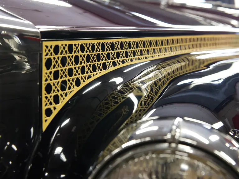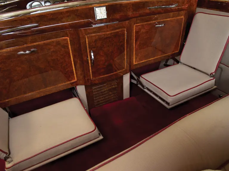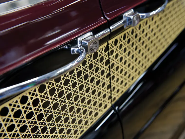 It is also believed, however, that the car was used by Victor Barclay, the managing director of Jack Barclay Ltd., the famed London Rolls-Royce dealer at Grosvenor Square, for his personal use before the car was sold privately. This cannot be confirmed conclusively, however. In the late 1980s, it was commissioned for a full cosmetic updating, done at Hooper Ltd., the London-based restorer, at a cost of over $100,000. Its most spectacular special feature is its sedanca sliding roof, which at the turn and pull of a handle neatly slides back and stows under the rear part of the roof, an engineering marvel perfected by James Young. Only nine Phantom V limousines were fitted with the sedanca sliding roof feature, all by James Young. Next is the hand-painted “faux” cane-work on both sides, reminiscent of the most elaborate limousines of the pre-war era, which complements the coachwork beautifully.