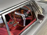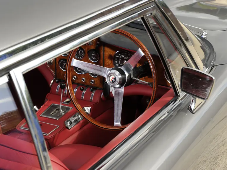 The body was stripped to bare metal and restored with new metal where necessary. The car was painted in Gunmetal Grey metallic, and the chassis was detailed at the same time. The suspension was dismantled and restored with new shock absorbers all around and new Coopercraft brakes. A full re-trim of the interior was carried out, the seats were re-trimmed in red leather, a red cloth headlining was fabricated, and every rubber seal was replaced with a new item. The dashboard was restored correctly, as was the wooden rim steering wheel. The power steering system was rebuilt, and five new stainless steel wire wheels and correct Dunlop tyres were also fitted.