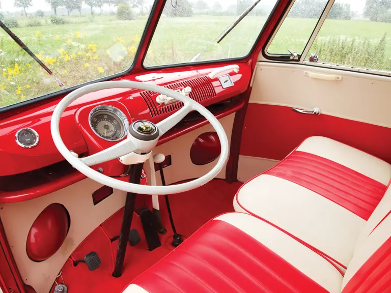 The rarest variant, the 21-Window Micro Bus, is in many ways considered the ultimate example, which makes it highly desirable amongst collectors today. It was delivered new to Rome, Italy, and it still wears its original Rome license plate, 822241, which was first registered on 1 April 1965. According to the Italian Estratto Chronologico, this 21-Window Micro Bus was registered to a lady owner in Italy, Mrs Nunzia Sinesi, who then sold it to Mr Elio Carchi. It then passed through another Italian owner and was finally sold to its last keeper, who was located in the Rome area and had it restored to its present condition. The chassis number verifies it as an original “Samba”, as they were colloquially called, although not by the factory. This example is finished in a lovely two-tone colour scheme of red and white, and the interior is finished in matching red and white vinyl with red carpeting, which appears to show some light soiling from use. The odometer shows 28,542 kilometres, and as the gauges appear to be completely unrestored, this may very well be the original mileage. It is also presented with an equally tidy engine bay. This Deluxe Micro Bus is universally desirable both in North America and on the Continent, and it is always eminently usable.
