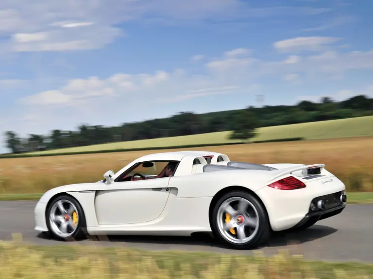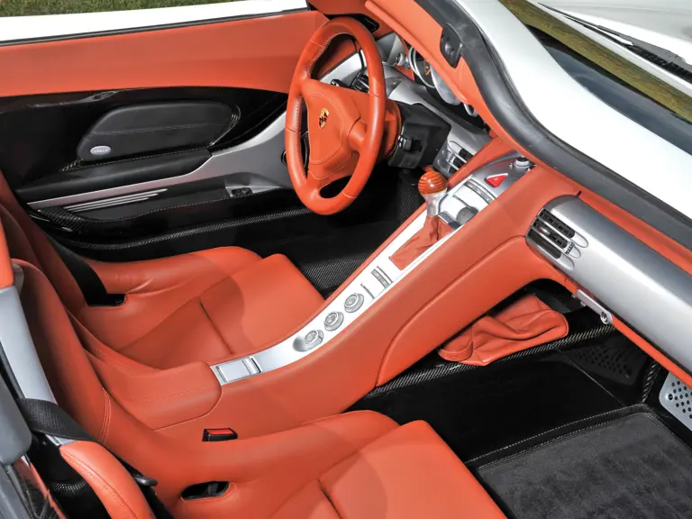 Even with the extensive use of lightweight materials, the Carrera GT weighed almost 3,100 pounds, which is attributed to the substantial chassis reinforcement installed to compensate for having removable roof panels. The chassis’ rigidity is impressive. Other weight-saving components included pressure-monitoring centre-lock wheels of forged magnesium, 19x9.5 inches in front and 20x12.5 inches in the rear, which were secured with racing-style centre-lock nuts. The steering was power-assisted, as were the huge anti-lock-bolstered disc brakes, whose rotors were of the same lightweight material as the clutch discs, providing incredibly effective stopping power. Occupants were cosseted by a fully trimmed leather interior, air conditioning, power windows, heated mirrors, a dot-matrix display screen, an entertainment system, aluminium racing-style pedals, and a footrest for the driver. Outside, there were Xenon headlights and an automatically deployed rear spoiler. Porsche claimed a 0–97 km/h acceleration time of 3.8 seconds, 0–200 km/h in just 9.9 seconds, and the promised maximum of 330 km/h.