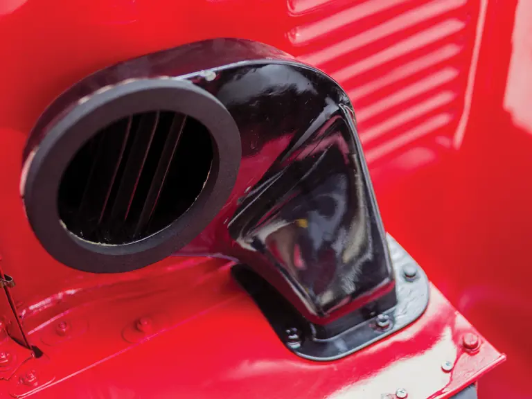 The Jaguar offered here is a magnificent example of one of the most sought-after versions of the E-Type: the Series 1 4.2-Litre from 1965. According to documentation available on file, it was exported from the US to Italy in the late 1980s. It later joined a large collection of ’50s and ’60s sports cars and was then subject to an extensive restoration in Italy starting in 1992. The car was completely finished more recently and has seen very little use since. It is currently presented in the iconic colours of Carmen Red over a black leather interior, as restored in Italy, and of course, it sports beautiful Dunlop chrome wire wheels. Notably, the seats are not of standard design, as the seat squabs are of custom construction to provide additional driving comfort. This E-Type offers the highly desirable above-mentioned mechanical improvements but still retains the original design’s most appealing stylistic features, such as covered headlights, a small bonnet air-intake, turn signal lights and taillights above the delicate horizontal blade bumpers, and exhaust tips that protrude under the number plate in the rear.