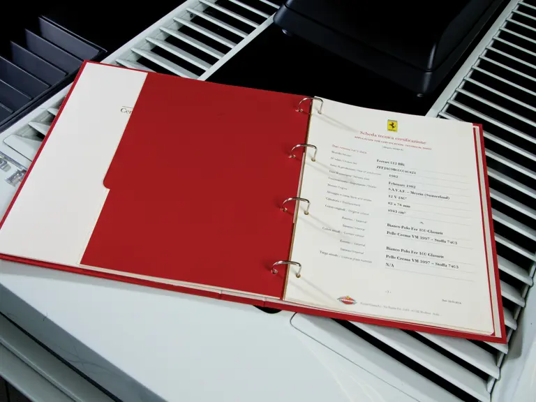 This example, chassis 40241, was delivered new to Geneva, Switzerland, in February 1982 and was originally finished in Bianco Polo (Fer 100 Glasurit) over Pella Crema (VM 3997), just as you see it today. As confirmed by its Ferrari Classiche certification, the car is indeed matching numbers throughout. Additionally, its odometer shows just under 13,500 kilometres from new, further separating this example from the rest as a truly exceptional 512 BBi. The car comes with very good service records, dating back to March 1982, with the last service having been carried out in March 2014 at 13,457 kilometres. The car currently resides in the Netherlands and is offered with not only its Ferrari Classiche binder but also a correct set of manuals.