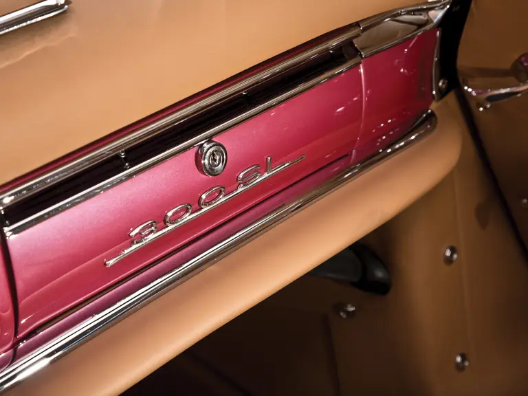 Finished in an extremely rare factory paint colour, as well as a two-year nut-and-bolt restoration by the Mercedes-Benz Classic Center in Irvine, California, that was completed in 2014, this dynamic 300 SL is a highly authentic and beautifully presented example of the classic Mercedes roadster. According to an original factory delivery notice, chassis number 7500239 was finished in Erdbeerrot (code DB 543), the exceptionally unusual, wonderful colour of Strawberry Red Metallic. Available only during the roadster’s first production year of 1957, Erdbeerrot is believed to have been applied to no more than 30 examples, making it one of the rarest of all the 300 SL factory colours.