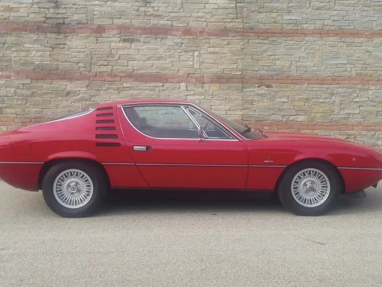 Two identical prototypes were prepared for the exhibition, and Gandini did not disappoint. Channelling many of the same cues that made the Miura so innovative, the new Alfa was wide and low with a shark-like nose extending through a curved fender and shoulder haunches into a truncated tail. The headlight “blinds” and stacked horizontal vents on the C-pillar were attractive, as well as futuristic in concept.