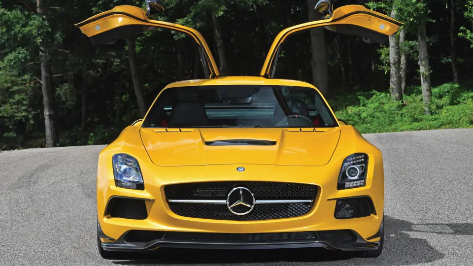 Intended to compete directly with other lightweight and high-horsepower exotics such as the Lamborghini Gallardo LP570-4 Superleggera and the Ferrari 458 Speciale, the SLS was more than capable of holding its own against the Italians. Its power output was raised to 622 brake horsepower and redline was increased to 8,000 rpm thanks to a revised high-speed valve train with modified camshafts, revised cam geometry, and special racing-specification tappets and intake air ducting. Furthermore, Mercedes-Benz’s engineers sought to trim the car’s weight by extensively using carbon fibre for the body panels and a number of mechanical components. Furthermore, the car’s luscious leather interior was largely replaced with light Alcantara, and the standard SLS’s steel exhaust was replaced with a titanium exhaust system.