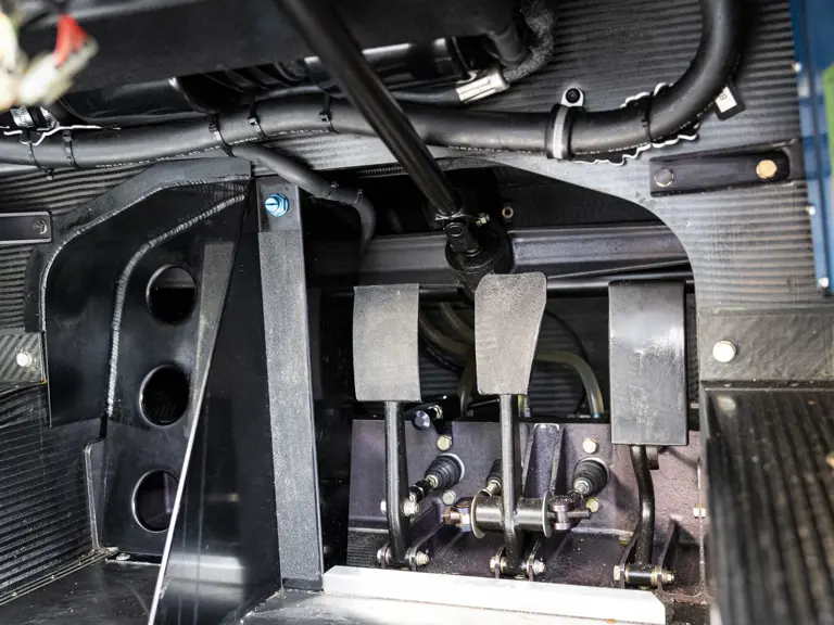 Drawing inspiration from the Le Mans-winning XJR-9, the XJR-15 featured a carbon monocoque “tub” designed by Jim Router and David Fullerton, which endowed the road car with greater headroom and a wider mid-section to accommodate both driver and passenger. The XJR-9 suspension—comprising fabricated wishbones and horizontal pushrod-spring dampers at the front and coil springs at the rear—was retained, while at each corner disc brakes paired with four-cylinder callipers served as anchors. The body, meanwhile, was penned by Peter Stevens, and was formed of a unique carbon fibre and Kevlar composite. While Stevens would go on to design the McLaren F1, the XJR-15’s extensive use of carbon fibre pre-dated McLaren’s all-carbon road car by two years.