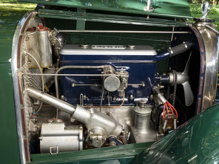 Built in 1925, this Avions Voisin C5—chassis 2770—was sent to Carrosserie Besset’s workshop to receive an extremely special “Faux Cabriolet” closed body. It is known the car remained in France, and by 1975 had been discovered in a barn. Photographs of the car following its discovery are on file. After emerging, chassis 2770 was acquired by a Swiss enthusiast and spent the next 31 years undergoing a complete restoration, photographs of which are included in the history file. The exterior was finished in two-tone green with the interior trimmed in Art-Deco-styled velour. A notable feature of the Besset coachwork is the ‘Toit Isothermic’ double roof, offering ventilation throughout the vehicle via adjustable shutters—arguably an early form of air conditioning.