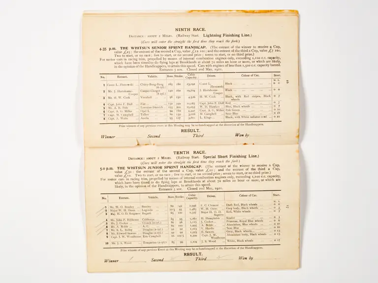 W.O. Bentley’s racing policy was instrumental, a means to an end. ‘The best way of selling motor cars is through racing success’. This mantra finds expression at Brooklands in 1921. Three Race Cards denote the first three wins for the trailblazing Bentley 3-Litre driven by W.O. Bentley and Frank Clement. Whit Monday 16 May 1921, the Whitsun Junior Sprint Handicap and the first-ever Bentley victory (oil stain on front cover), the June Junior Sprint Handicap, 25 June and the first 90 mph Short Handicap held on 1 August.