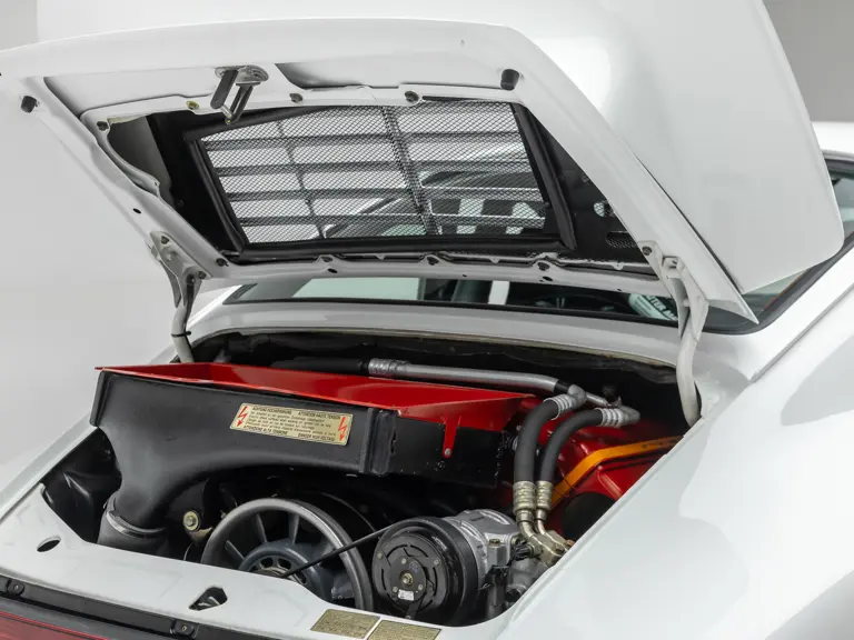 Alongside the weight loss regimen, the Turbo S Lightweight’s type M30/59 SL engine was fitted with more aggressive cams, larger fuel injectors, and a more efficient KKK turbocharger, which boosted output to 381 horsepower at 6,000 rpm—a 61-horsepower improvement over the standard 3.3-litre Turbo. Visual changes announcing this special engine included rear-quarter vents derived from the 959, new front air-intake ducting, as well as a revised rear spoiler.