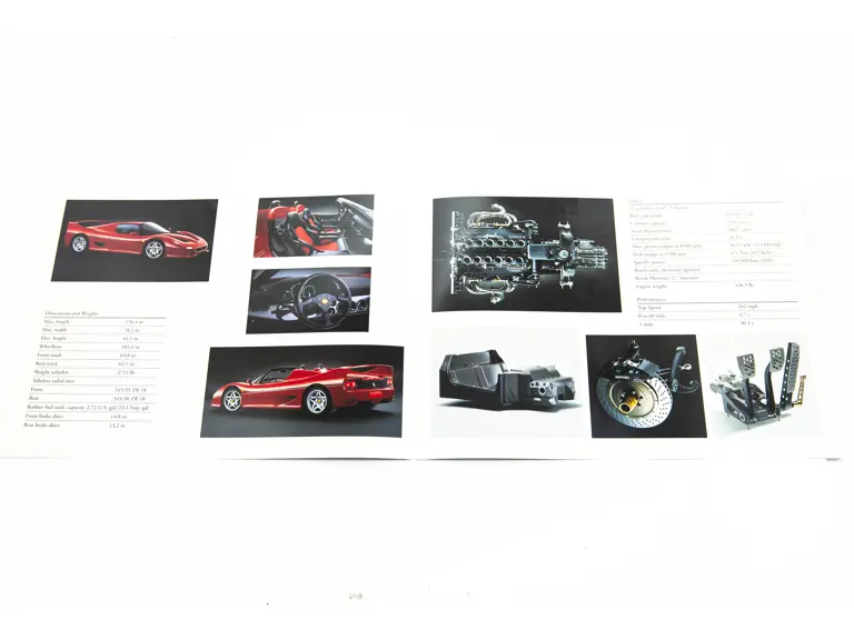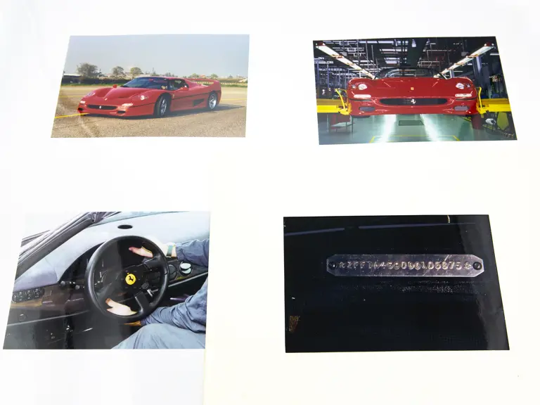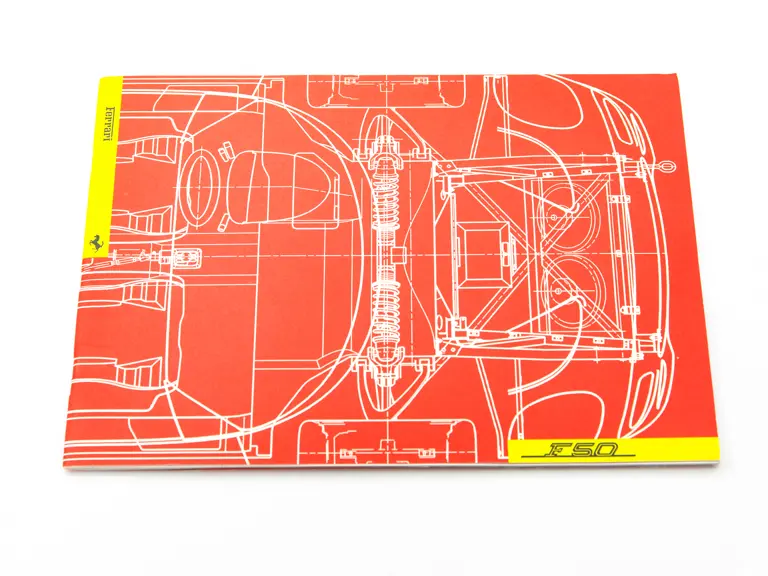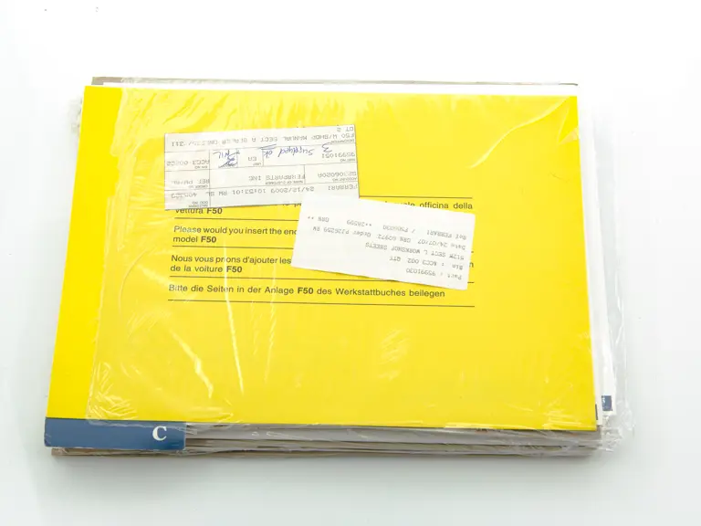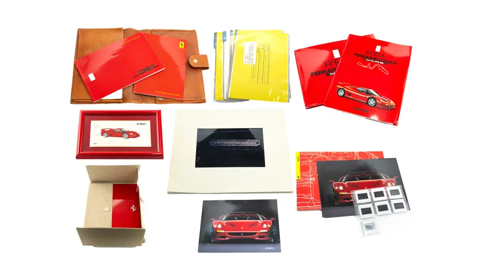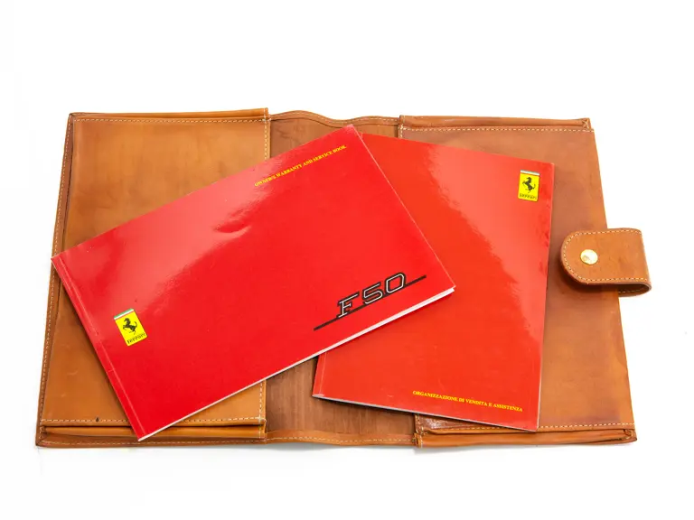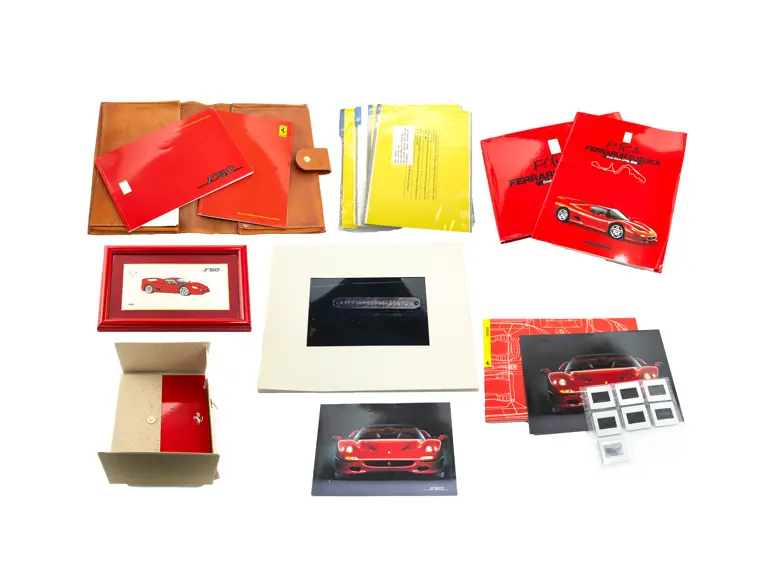 Contains a leather Schedoni folio with the Owner’s Manual, Service Book and Warranty Card for a Ferrari F50. It is accompanied by a host of desirable literature including technical sheets, posters, an F50 presentation brochure and photographs of a car being assembled at Maranello. The F50 in the photos is chassis number ZFFTA46B000106875 and the owner's books are made out to chassis number ZFFTG46A9S0104149.