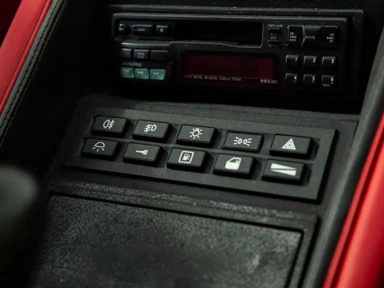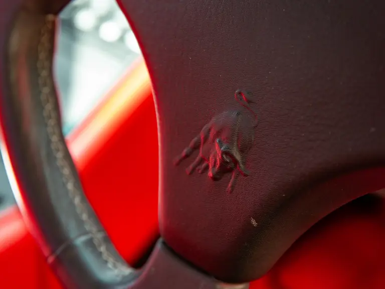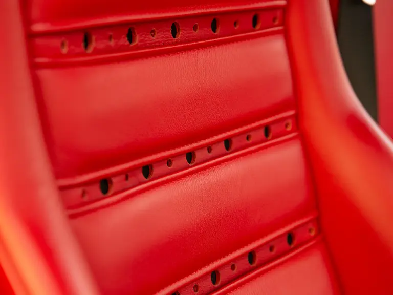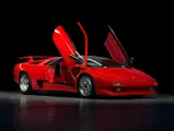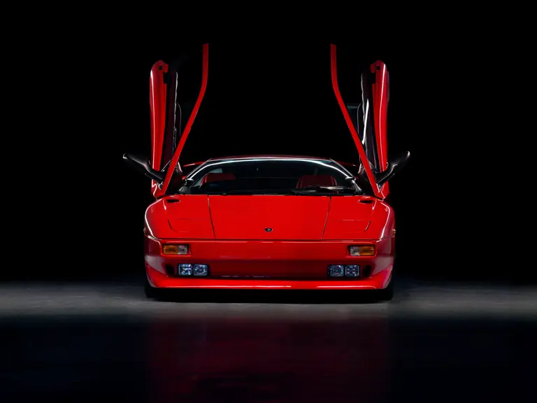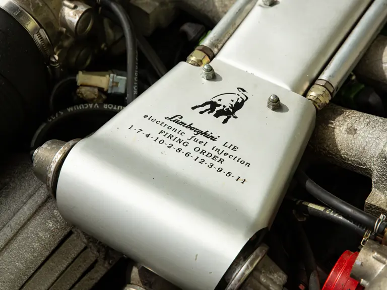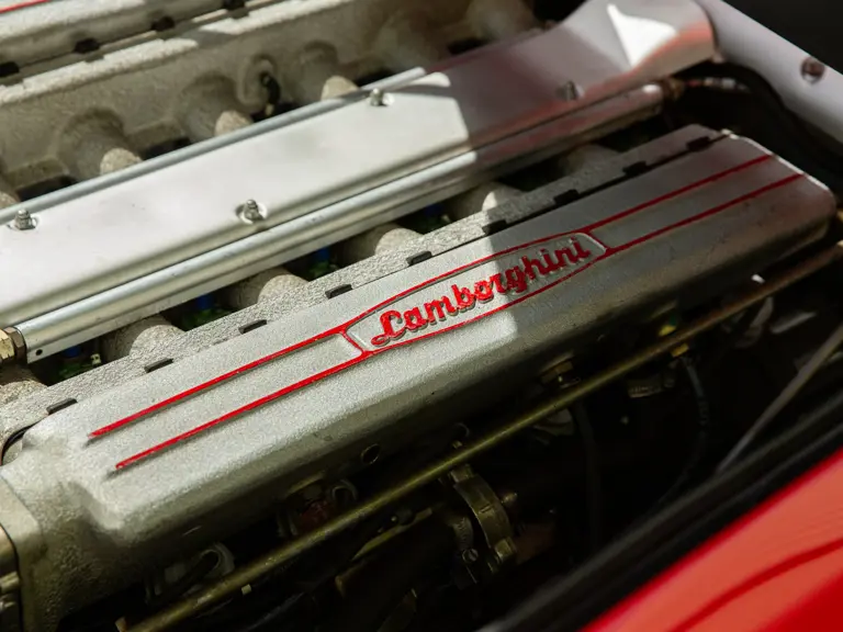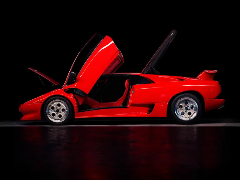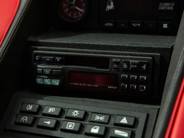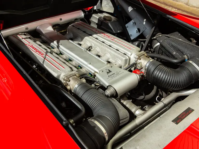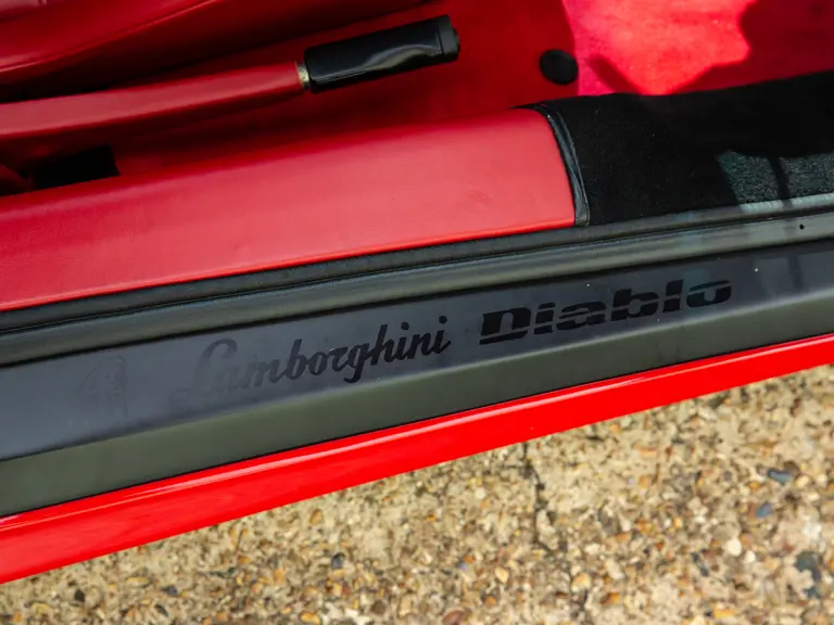 Built in right-hand-drive form and specified with suitably striking Rosso paint over Rosso leather upholstery, accompanied by matching-colour carpets and a contrasting Nero dashboard, this car retains the early Diablo’s distinctive “cliff” instrument binnacle. According to the Lamborghini Registry, it was originally delivered in the United Kingdom through official marque dealership Portman Lamborghini London on 22 September 1993.