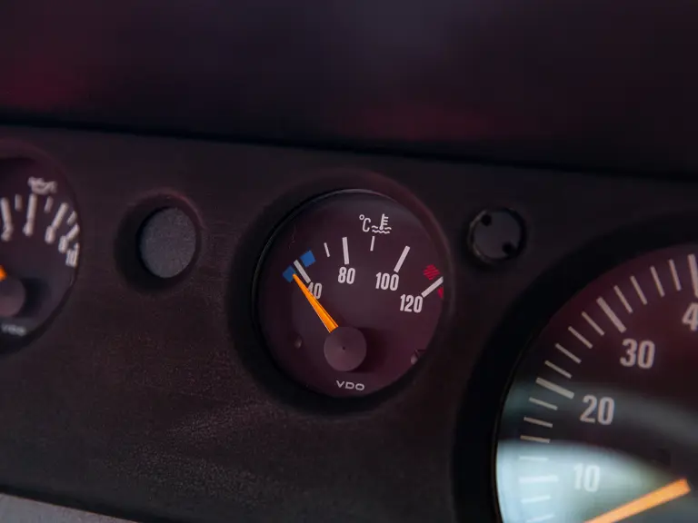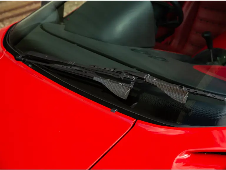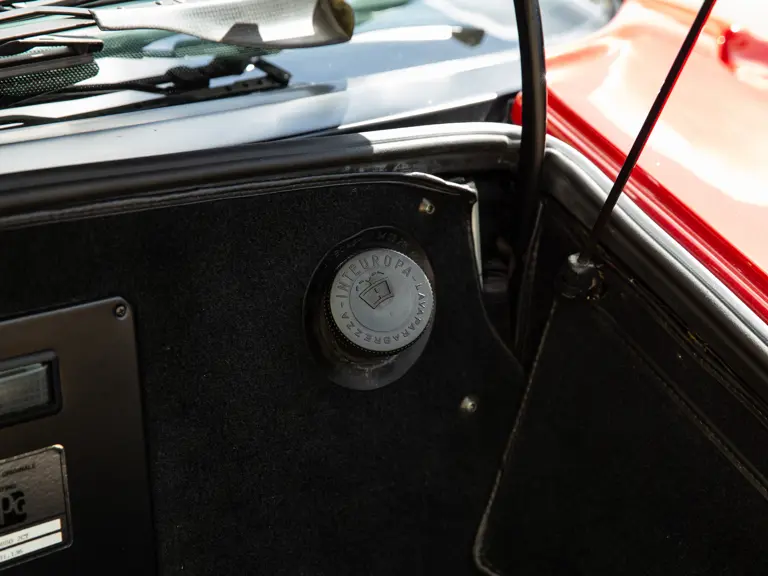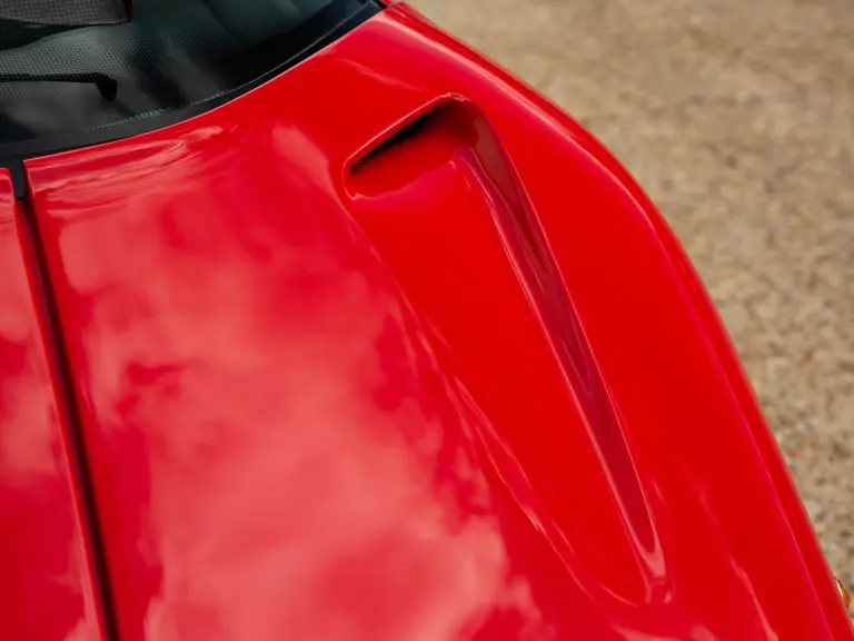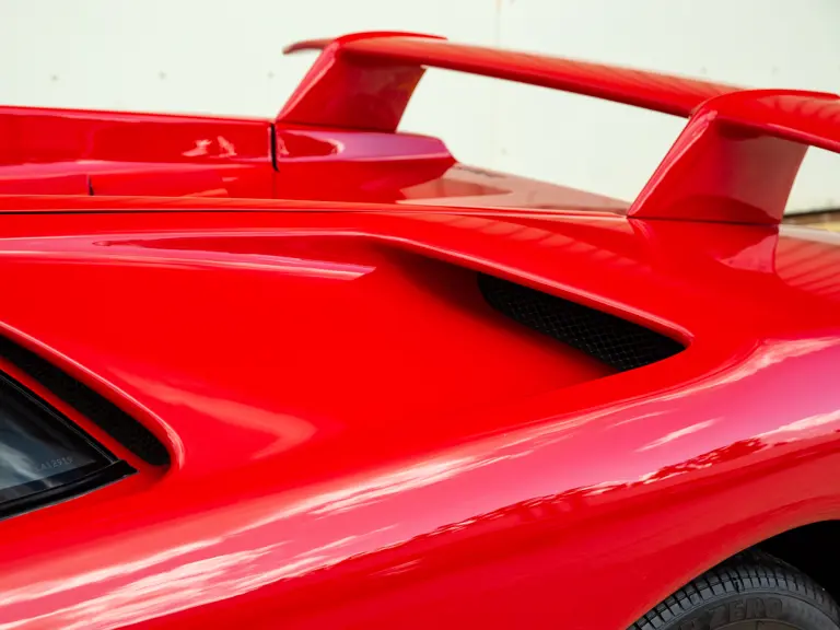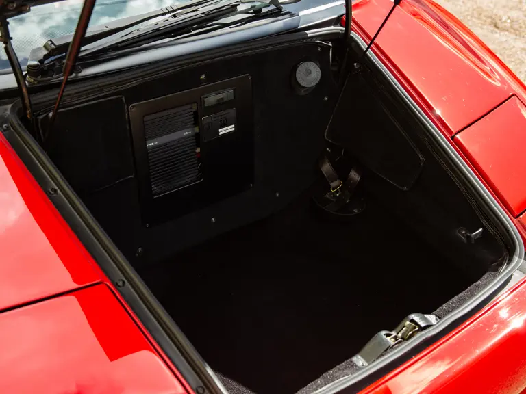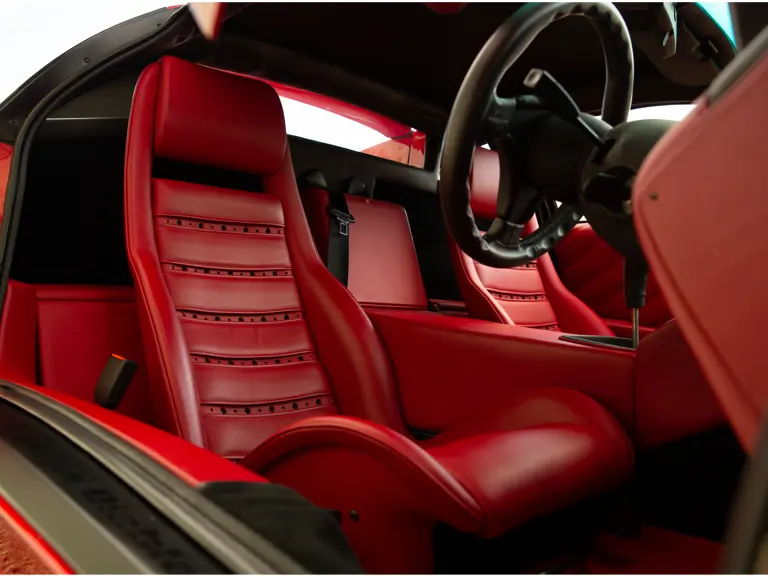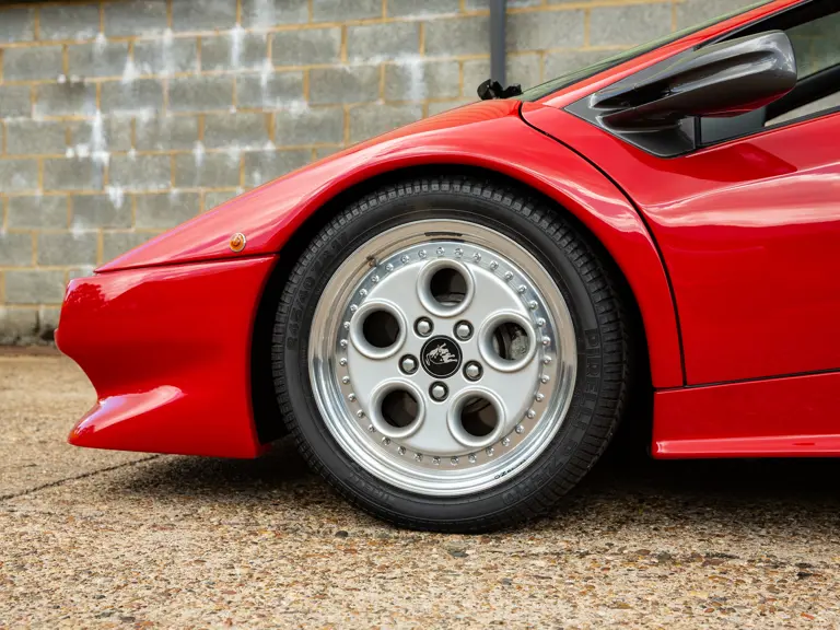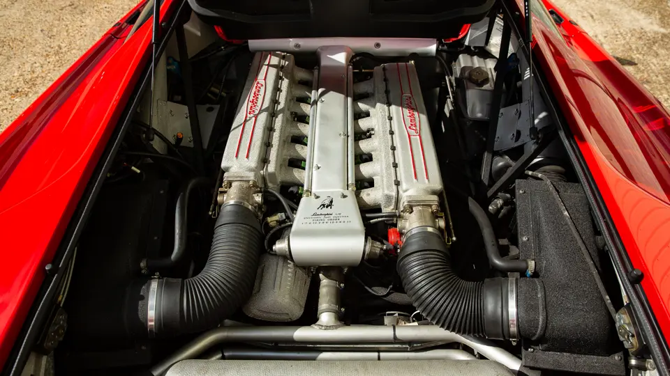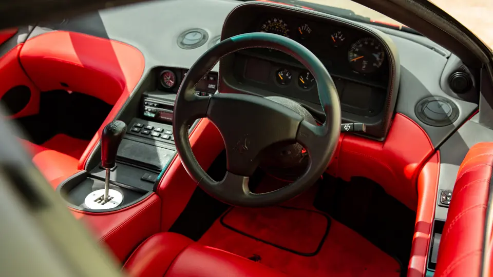 Built in right-hand-drive form and specified with suitably striking Rosso paint over Rosso leather upholstery, accompanied by matching-colour carpets and a contrasting Nero dashboard, this car retains the early Diablo’s distinctive “cliff” instrument binnacle. According to the Lamborghini Registry, it was originally delivered in the United Kingdom through official marque dealership Portman Lamborghini London on 22 September 1993.