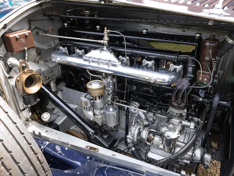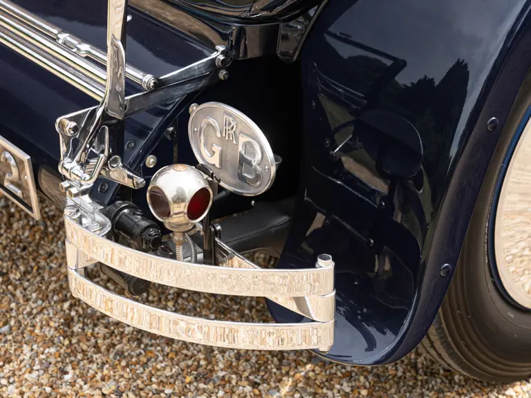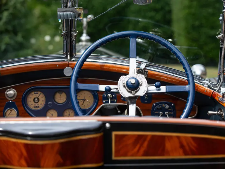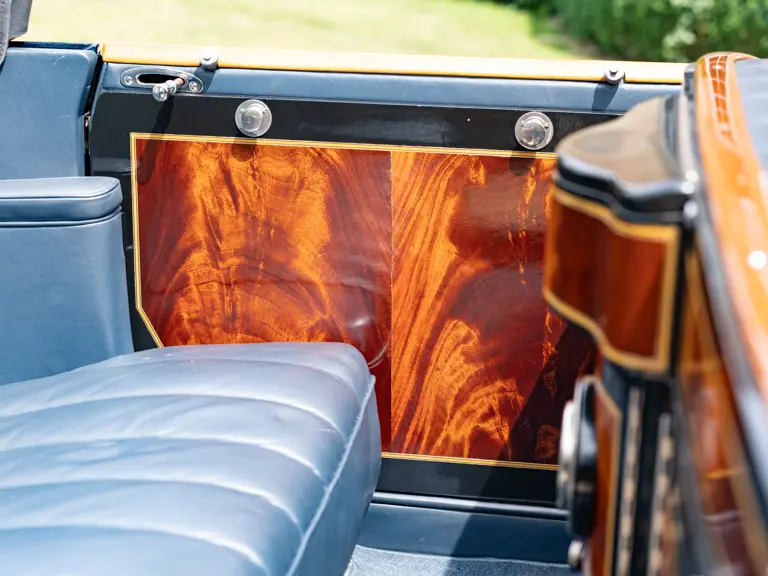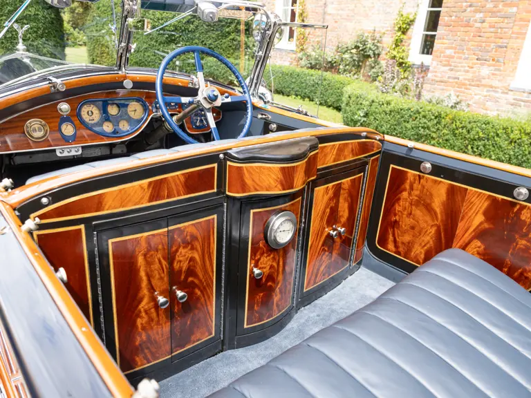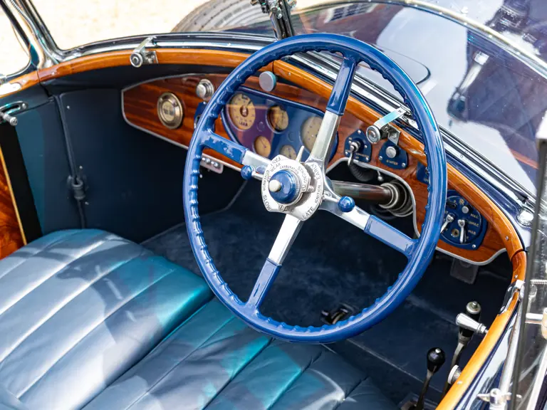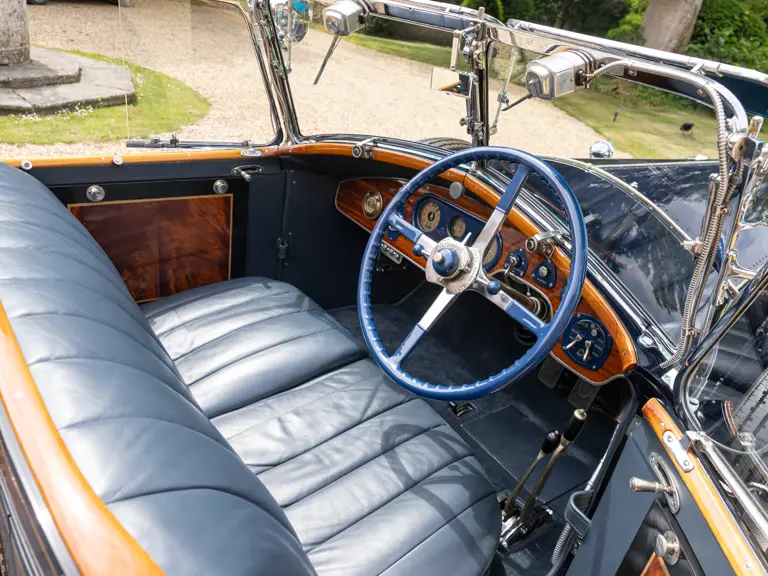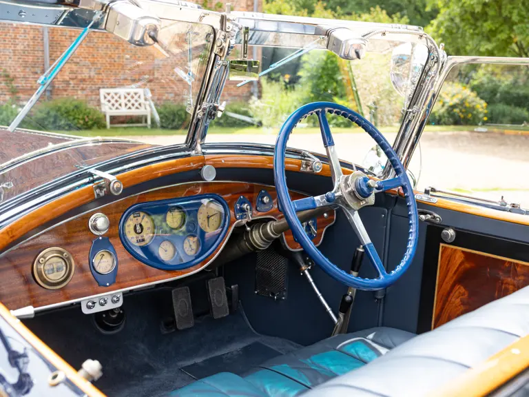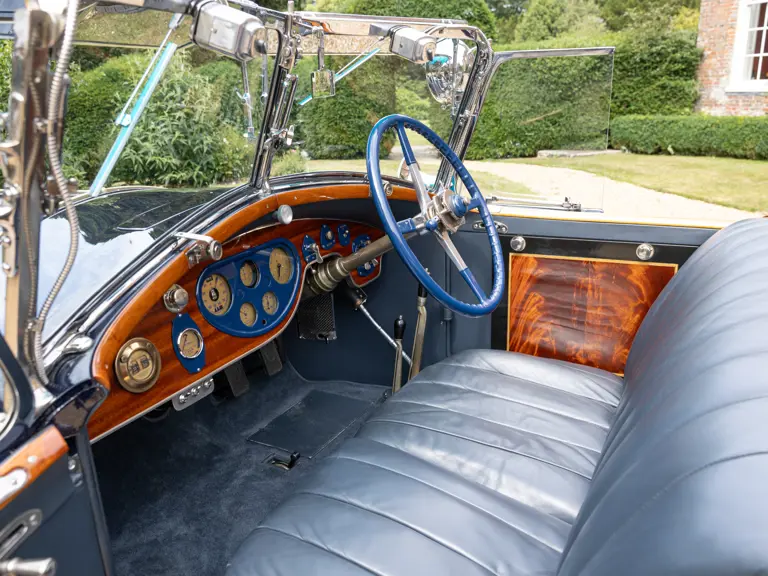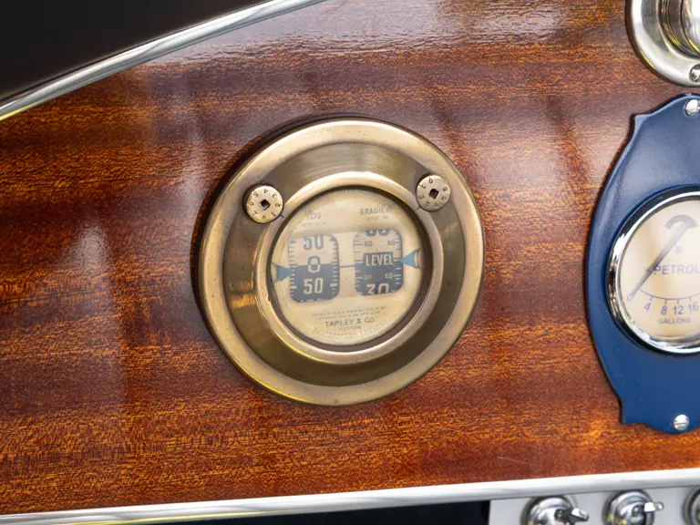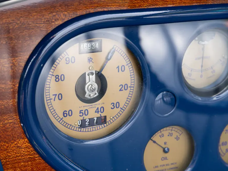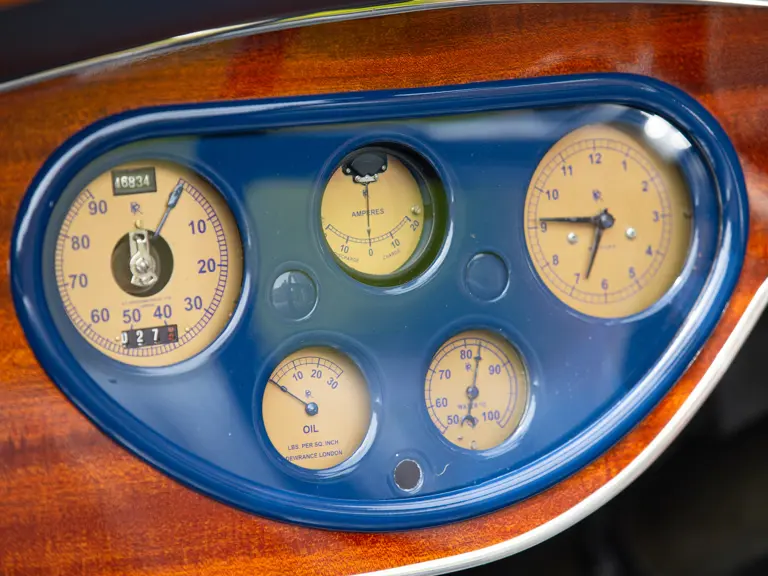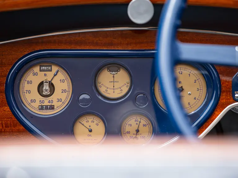 The especially low and striking torpedo tourer body was built by Barker, the fabled London coachbuilders to royalty, with a straight-though beltline molding, sharply vee’d windscreen with built-in sun visors, and a steering wheel, control knobs, and instruments finished to match the body in Nile Blue; a Tapley gradiometer, necessary for negotiating the rather rough Indian roads; and a nickeled cobra horn and tool trays mounted in the running boards. Rolls-Royce custom-finished the instruments themselves but were, amusingly, unsatisfied with their own work; the build records note that ‘the Nile Blue finish generally is not considered satisfactory and is to be rectified at Barker’s.’
