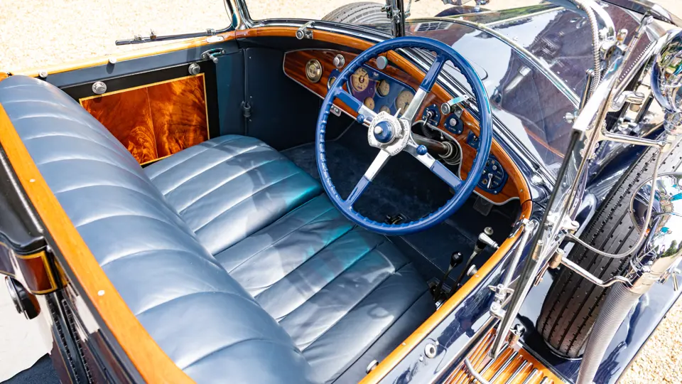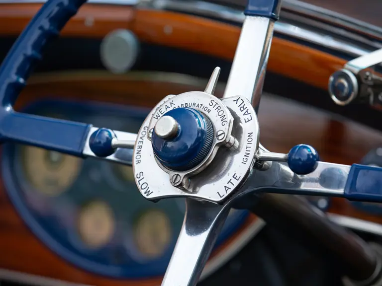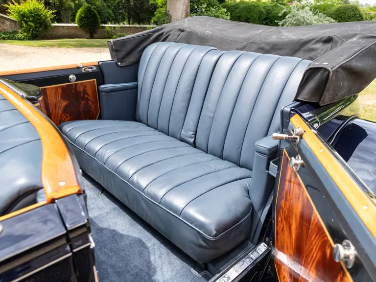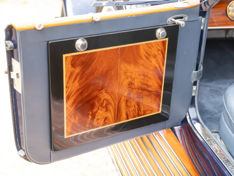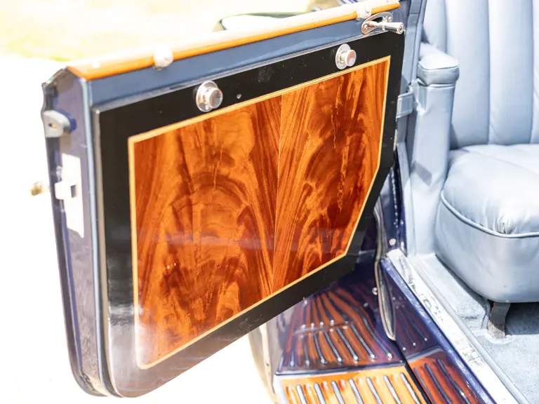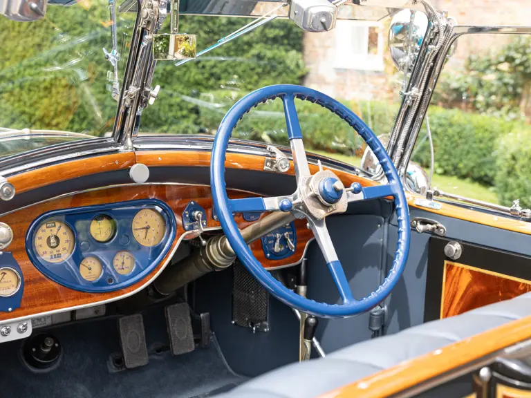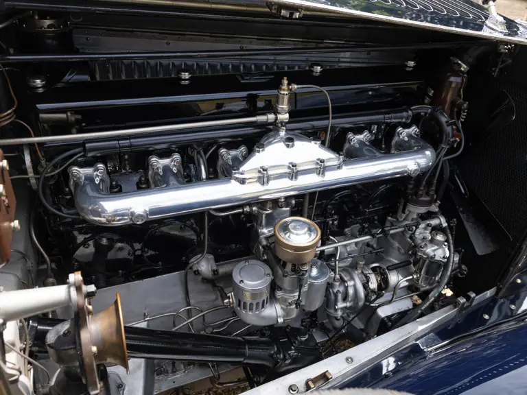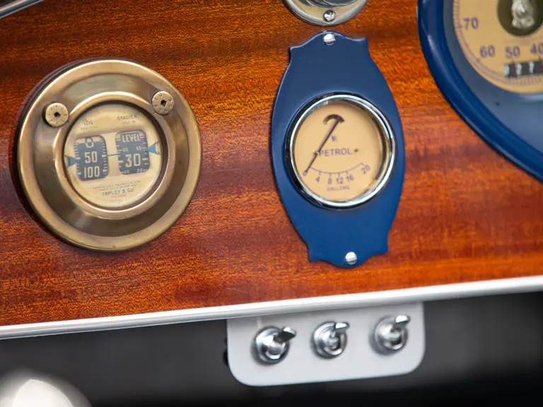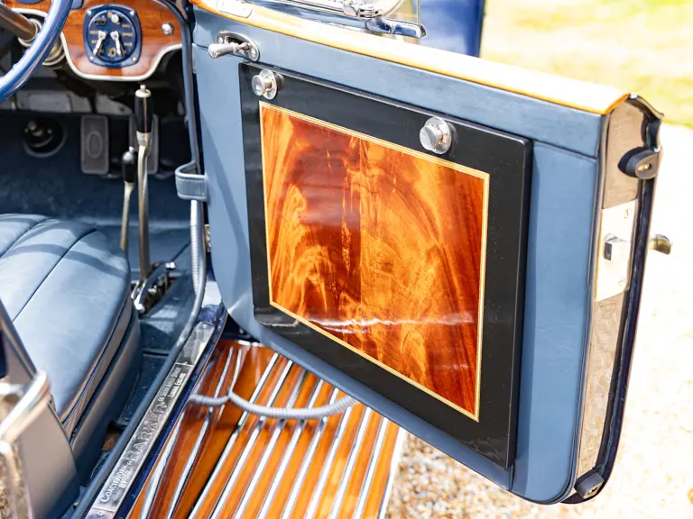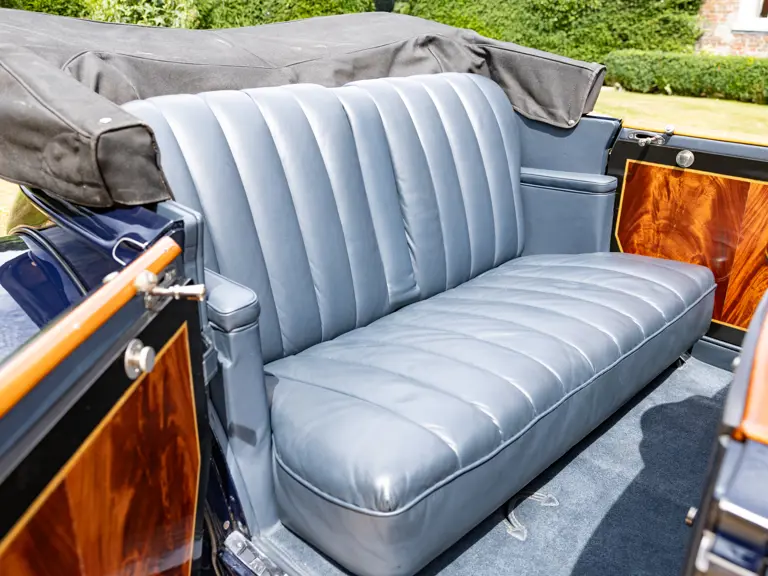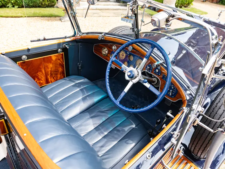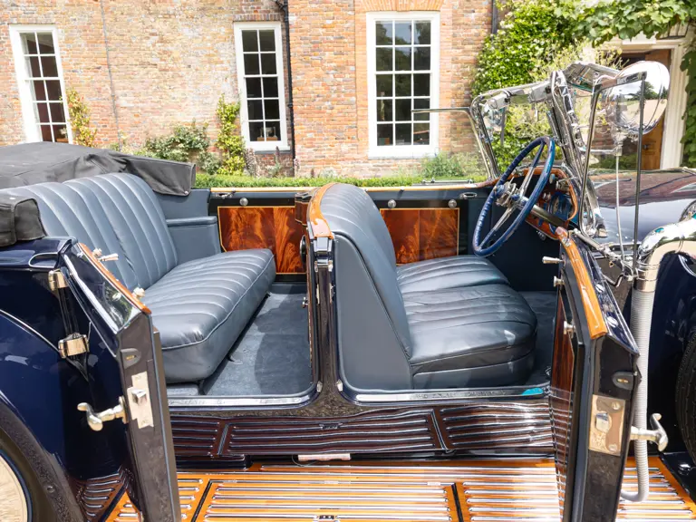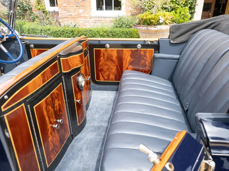 The especially low and striking torpedo tourer body was built by Barker, the fabled London coachbuilders to royalty, with a straight-though beltline molding, sharply vee’d windscreen with built-in sun visors, and a steering wheel, control knobs, and instruments finished to match the body in Nile Blue; a Tapley gradiometer, necessary for negotiating the rather rough Indian roads; and a nickeled cobra horn and tool trays mounted in the running boards. Rolls-Royce custom-finished the instruments themselves but were, amusingly, unsatisfied with their own work; the build records note that ‘the Nile Blue finish generally is not considered satisfactory and is to be rectified at Barker’s.’