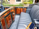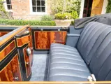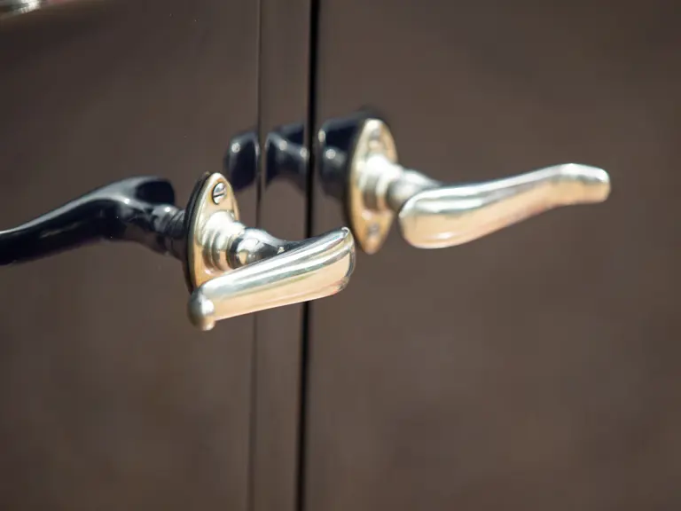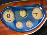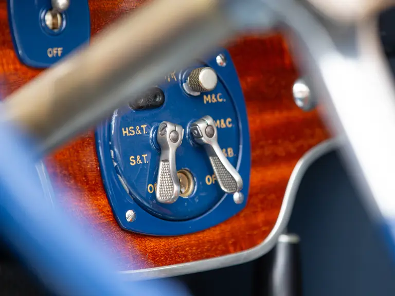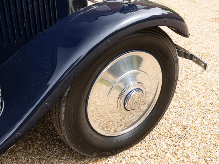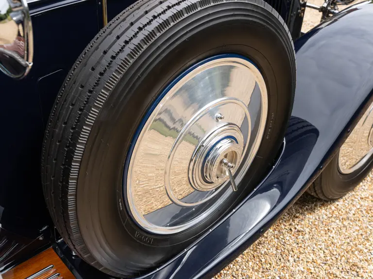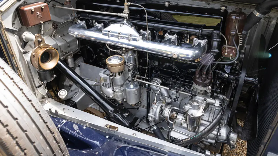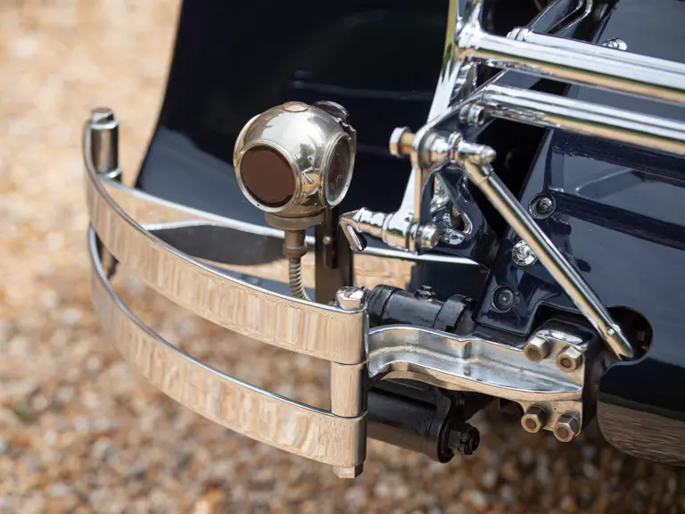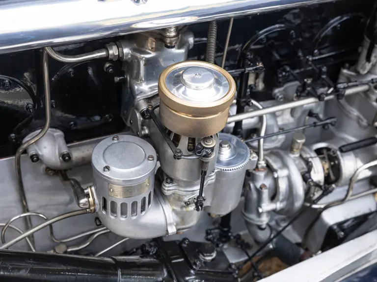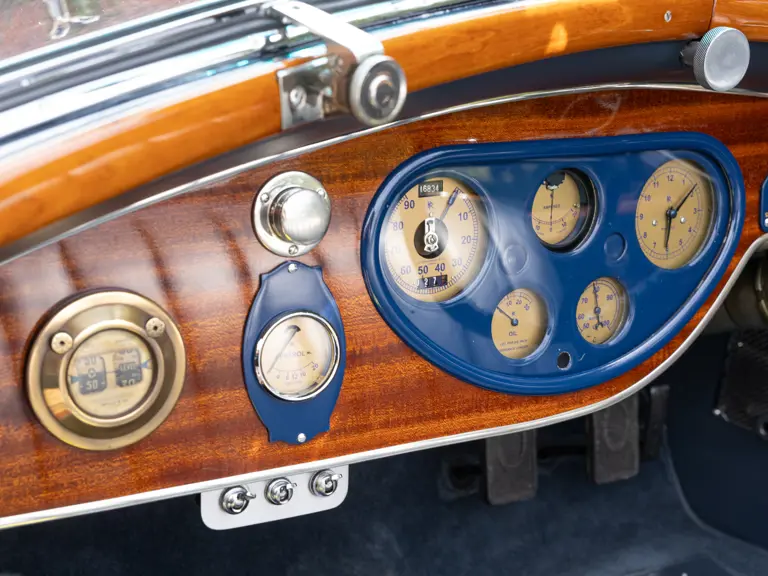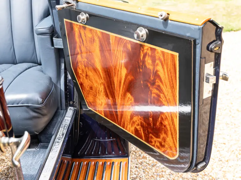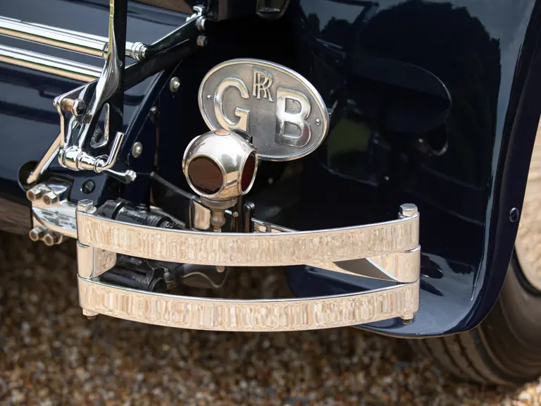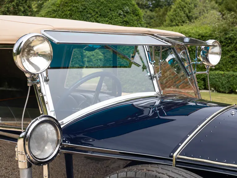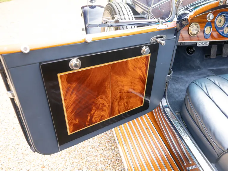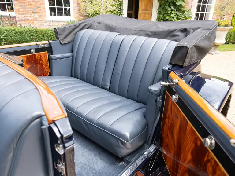 The especially low and striking torpedo tourer body was built by Barker, the fabled London coachbuilders to royalty, with a straight-though beltline molding, sharply vee’d windscreen with built-in sun visors, and a steering wheel, control knobs, and instruments finished to match the body in Nile Blue; a Tapley gradiometer, necessary for negotiating the rather rough Indian roads; and a nickeled cobra horn and tool trays mounted in the running boards. Rolls-Royce custom-finished the instruments themselves but were, amusingly, unsatisfied with their own work; the build records note that ‘the Nile Blue finish generally is not considered satisfactory and is to be rectified at Barker’s.’