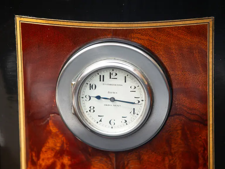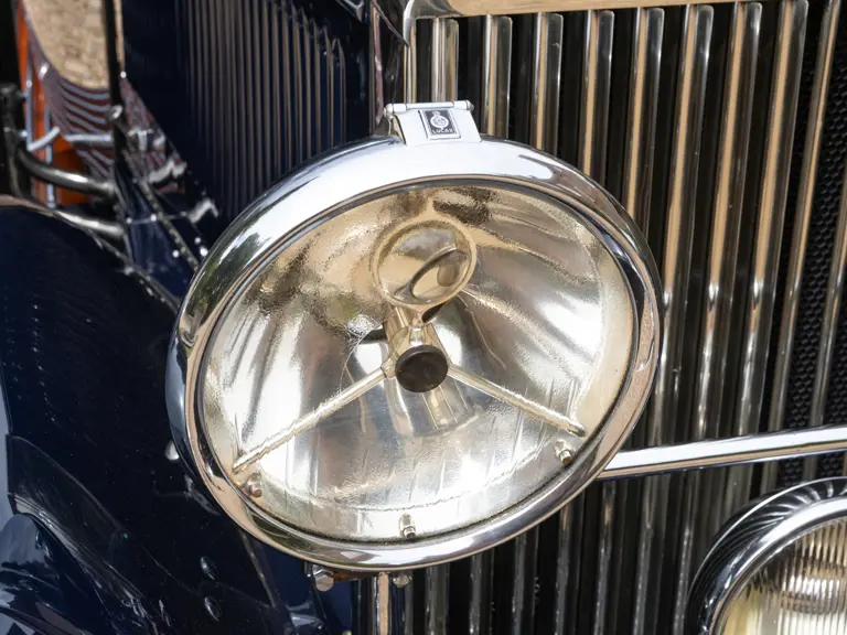 As was typical of Barker’s craftsmanship, the interior was beautifully finished with the inlaid cabinetry for which their craftsmen were justly renowned. Finishing touches included polished disc wheel covers and a full complement of lighting, including Lucas P100 headlamps, a single driving lamp, dual fender lamps, and cowl-mounted spotlamps, necessary for nighttime use in the motorcar’s destination. The finished car was featured in the August 1930 issue of The Autocar, by which time it had already been shipped from London to Calcutta aboard SS Bangalore.