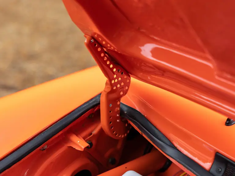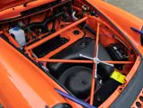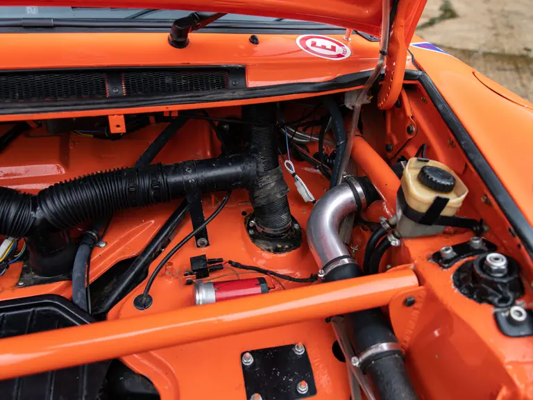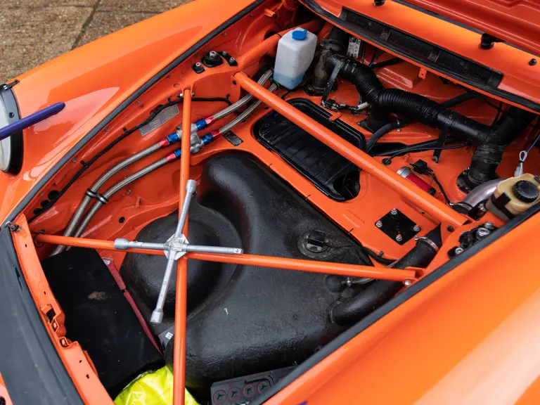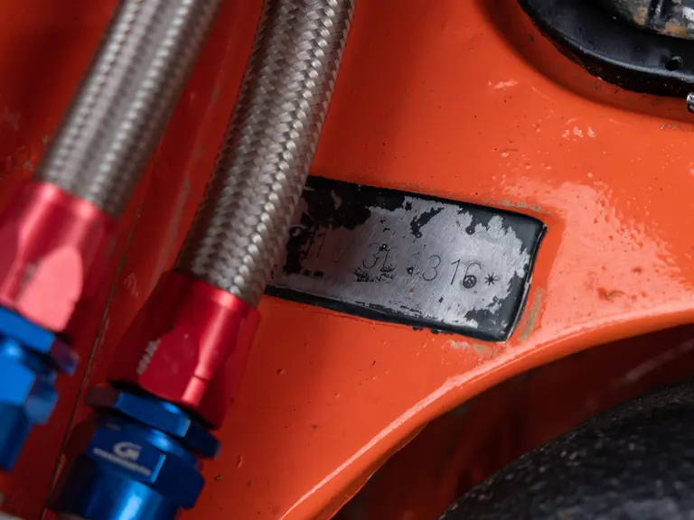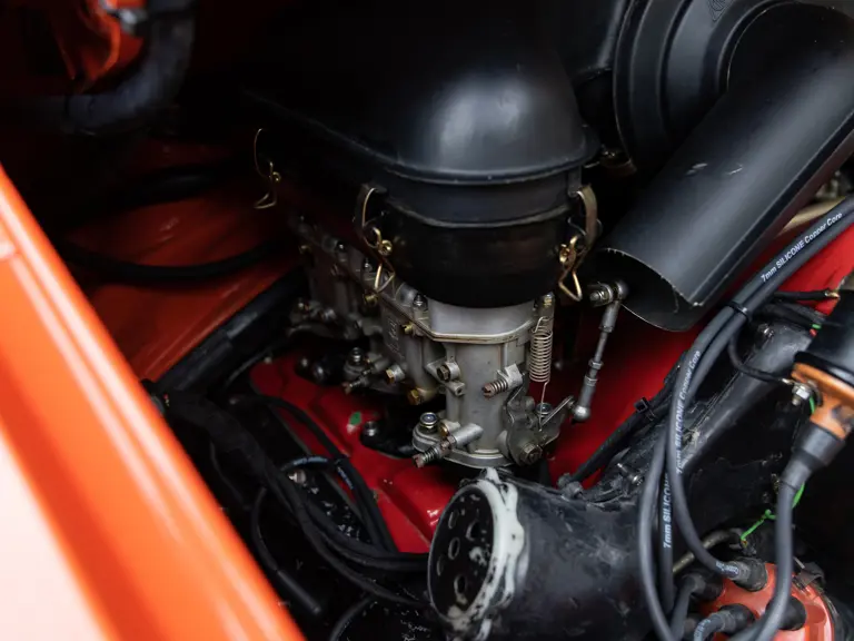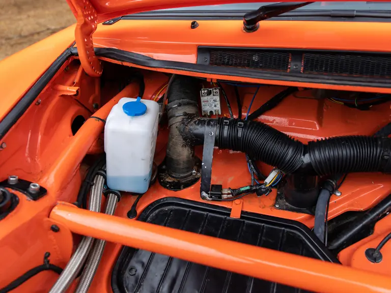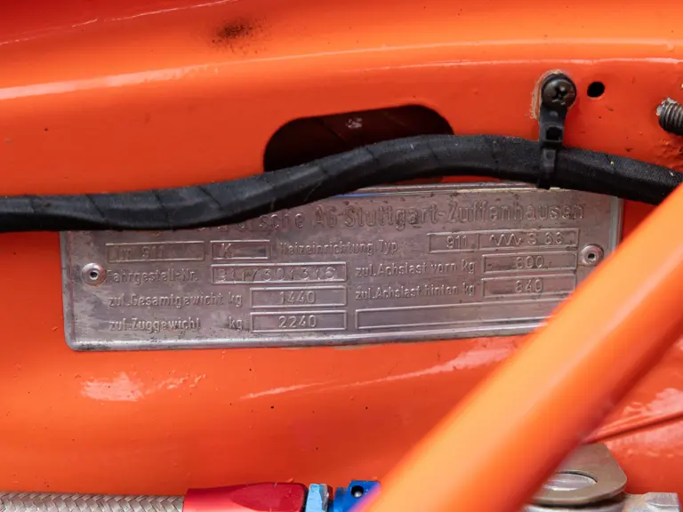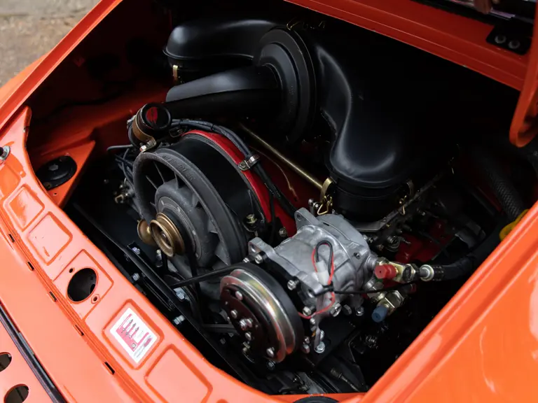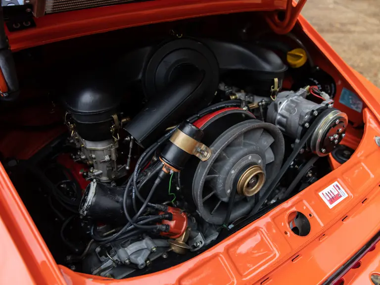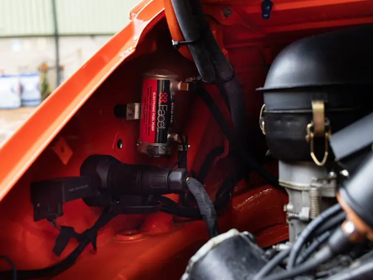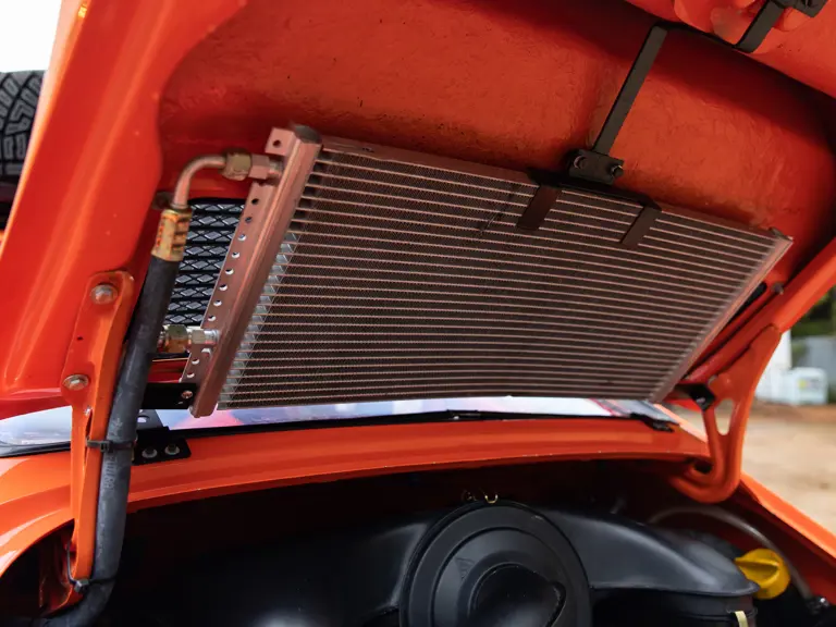 Mechanically, the suspension received specially modified elements, which allow for a ride-height 12 centimetres above the stock setting. Dampening is controlled via shock absorbers made from thicker tubes and longer travel to handle uneven surfaces with greater compliance. The modified, rear-mounted, flat-six, 2.7-litre engine breaths through custom Weber carburettors and feeds power through a special aluminium racing clutch to a type 915 manual gearbox. A front-mounted oil cooler aides in the maintenance of operating temperature. In June 2020, the engine was rebuilt and invoices on file reveal the sum of CHF 24,949 to complete the project.