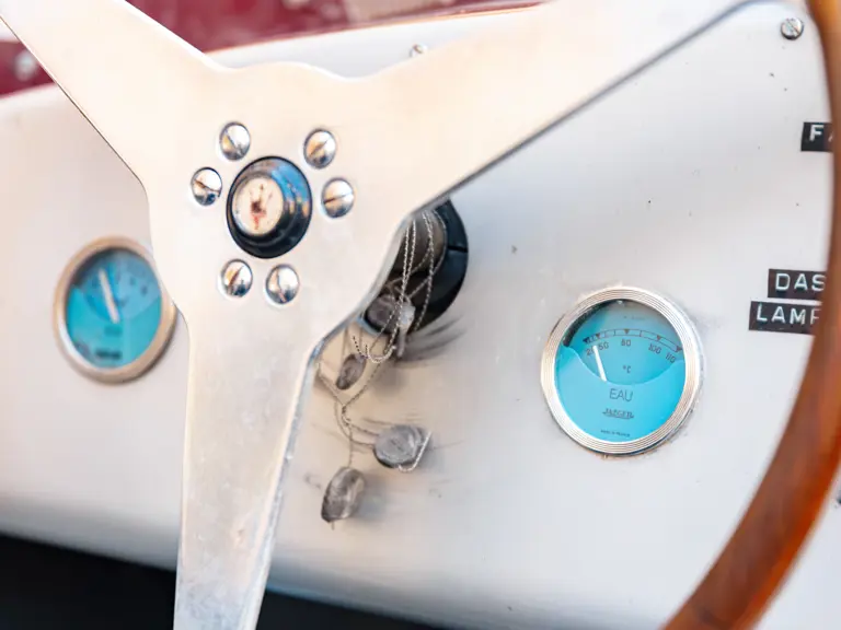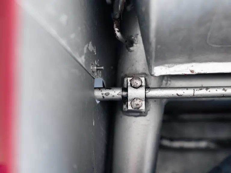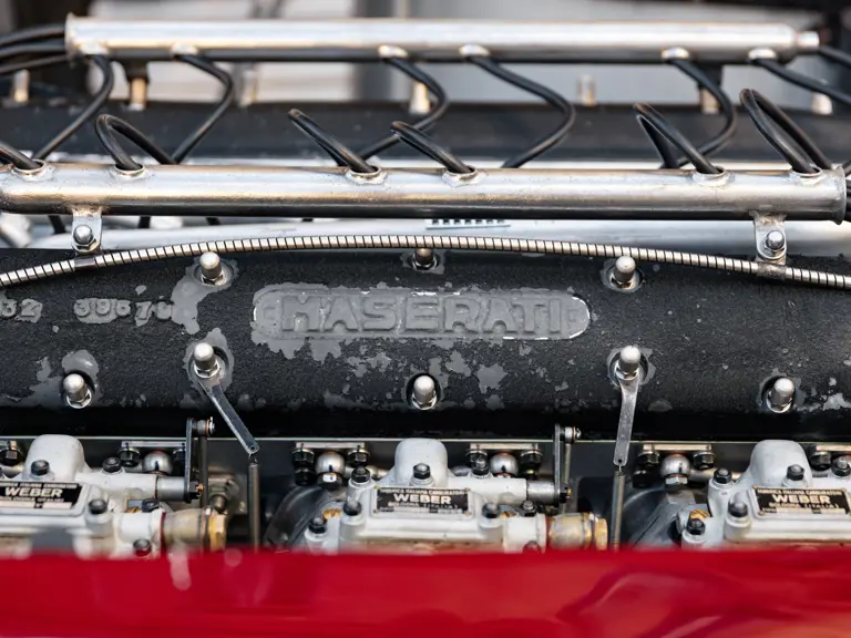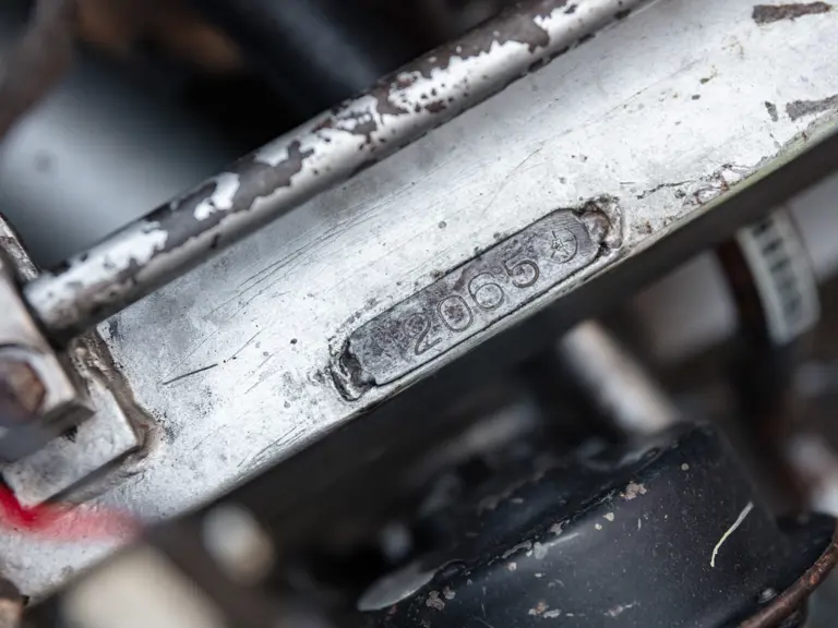 The chassis paint history can be traced and shows its correct series of coatings in sequence to what finally appears to have been a cheap and quick cosmetic overspray made during the Italian restoration. Many matching factory assembly numbers are present on the car and the serial number 2065 is of course stamped on the cylinder head and chassis. Additionally, after cleaning decades of grime on the steering box casing, the stamped number 2065 was also discovered in the correct Maserati font for the period. A most important discovery was also made on the anti-roll bars which have been sleeved and the sleeve seam then welded. This was barely visible under the layers of paint but reference to the 1954 build sheet, issued officially by the factory in 1998, states that a special client request was made to stiffen the roll bars—“barra de compensations diamètre 14 (Tipo a tube latérali saldati)”. As far as it is known, 2065 may be the only A6GCS with this factory modification. A 12-page detailed report is included in the history file. The A6GCS is further accompanied by an October 2025 inspection report by the Maserati historian Walter Bäumer (available to view on file). He concludes: 'Chassis #2065 is for sure one of the most original A6GCS in existence and had kept all traces of its life. Only very few cars from that series are original today.'