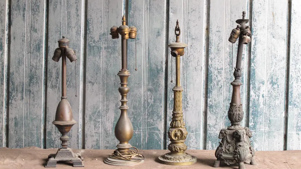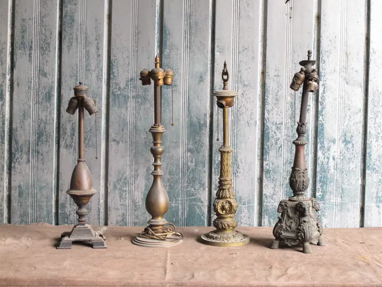 Lot consists of 4 table lamp bases, 1 with an elaborate floral motif, 1 with rams heads and hoof feet.